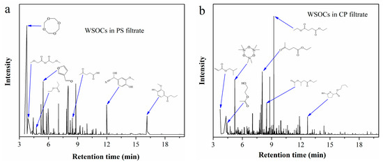 Total ion chromatogram of the extracts from (a) PS filtrate; (b) CP filtrate.