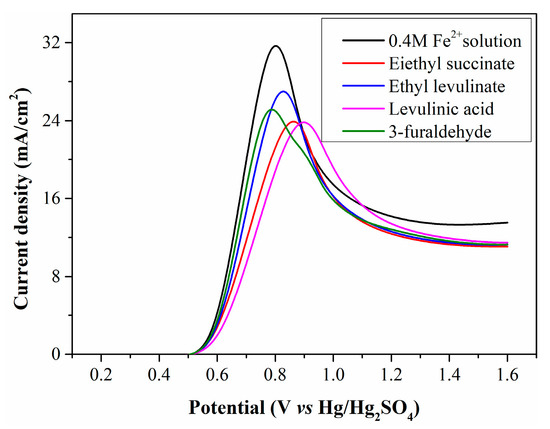 To confirm whether Fe2+ electrooxidation is restricted by WSOCs, simulated solutions were prepared by adding diethyl succinate, ethyl levulinate, levulinic acid, and 3-furaldehyde to a 0.4 mol/L standard Fe2+ solution, then electrolyzed in the anode chamber. The resulting LSV curves (Figure 6) show that the initial oxidation potential of the simulated solutions matches that of the standard Fe2+ solution, indicating these organic substances are not oxidized at low potentials. However, the peak current density of the simulated solutions is significantly lower than that of the standard Fe2+ solution, confirming the harmful effect of WSOCs on Fe2+ electrooxidation. Some organic substances exhibit high surface activity, reducing solution surface tension and facilitating their accumulation on the electrode surface. This accumulation decreases contact efficiency between Fe2+ and the anode surface, lowering current density.