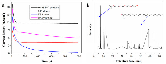 The viscous organic substances coated on the electrode surface were dissolved with ethyl acetate, and the resulting solution was analyzed by GC-MS. According to the total ion chromatogram in Figure 7b, 3,6,9,12-tetraoxatetradecan-1-ol and erucylamide are easily identified as key components. A simulated solution prepared by adding 5 mL of erucylamide to 95 mL of 0.4 mol/L standard Fe2+ solution was electrolyzed, with the LSV curve (Figure 7a) confirming that erucylamide reduces the Fe2+ electrooxidation rate. Additionally, the clean surface was recoated with erucylamide after electrolysis of the simulated solution.