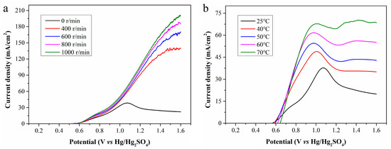 LSV curves of CP filtrate at (a) different rotation speeds; and (b) different temperatures.