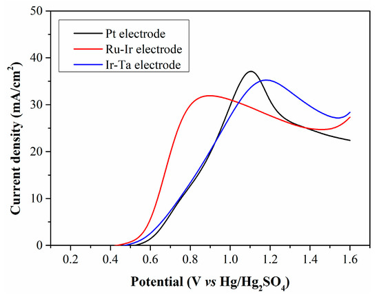 The type of anode material plays a crucial role in reducing anodic overpotential. The oxidation characteristics of Fe2+ on common precious metal electrodes are discussed, and the results are demonstrated in Figure 9. When the filtrate is electrolyzed using Pt and Ir-Ta electrodes, there is no significant difference in peak current density, and the LSV curves exhibit a high degree of overlap at low potentials. In contrast, the peak current density obtained with the Ru-Ir electrode is relatively low, while this electrode enables a higher current density at low potentials.