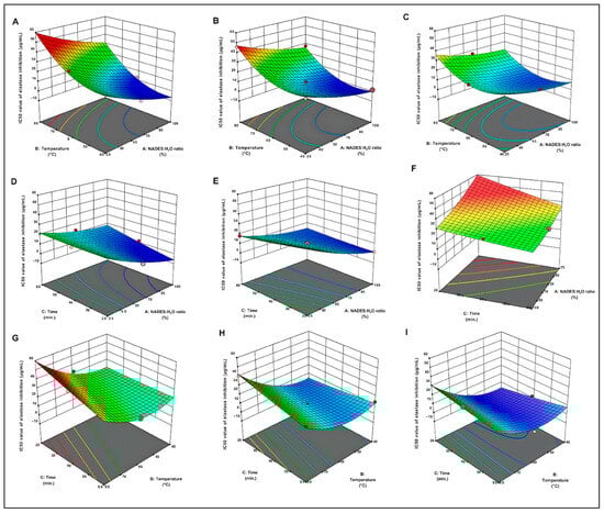 The relationships between the extraction variables (NADES ratio, temperature, and time) and elastase inhibition were subsequently evaluated using the BBD (Section 2.2), followed by optimization studies presented in Section 2.4.