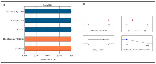 The desirability score serves as a critical metric for evaluating optimal conditions. A desirability score approaching 1 enhances the precision of the assessed conditions [53]. The proposed model delineates optimal conditions aimed at minimizing the desirability for elastase inhibition, thereby formalizing the model equation. The desirability scores recorded were 1 for elastase inhibition (Figure 2A). The optimal parameters identified for achieving the highest elastase inhibition effect included a NADES/H2O ratio of 99.79%, an extraction temperature of 51.30 °C, and an extraction duration of 49.58 min (Figure 2B).