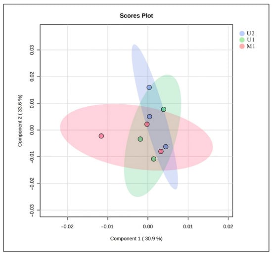 The Principal Component analysis (PCA) score plot illustrates the distribution of metabolite profiles obtained from three different extraction methods (U1, U2, and M1) (Figure 3). The first two principal components (PC1 and PC2) together explain 64.5% of the total variance in the dataset (30.9% and 33.6%, respectively). Samples from each extraction method form partially overlapping clusters, indicating that the methods yield comparable overall metabolite profiles. However, slight separation between groups suggests subtle differences in extraction efficiency and compound selectivity. The proximity of U1 and U2 clusters implies that these two methods isolate metabolites with similar polarity and chemical characteristics, whereas M1 shows a slightly broader distribution, reflecting a more diverse extraction pattern. Overall, the PCA results demonstrate that all three methods produce reproducible data, with U1 and U2 showing higher similarity in metabolite composition (Figure 3).