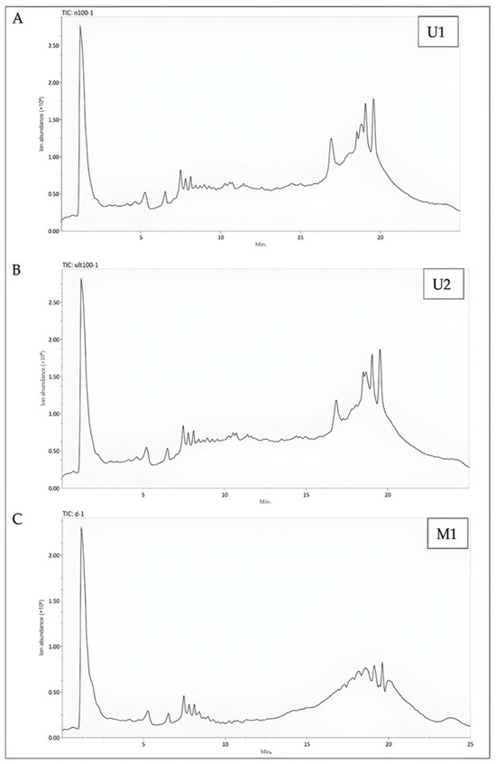 The tests were conducted in triplicate, and the results are expressed as mean ± standard deviation. IC50 values were determined from the regression equation of a linear curve plotted by the logarithm of the concentrations against the percentage inhibition values. Statistical analyses were performed using IBM SPSS Statistics software (Version 24.0) [83]. Principal Component Analysis (PCA) was performed to visualize the overall variance and identify clustering patterns among samples obtained from different extraction methods (U1, U2, and M1). PCA is an unsupervised multivariate statistical technique that reduces the dimensionality of complex datasets while retaining most of the variation present in the data [24]. In this study, PCA was applied to assess the reproducibility and discrimination capability of the extraction protocols. The first two principal components explained the majority of total variance, allowing the evaluation of similarities and differences in metabolite profiles across extraction methods.