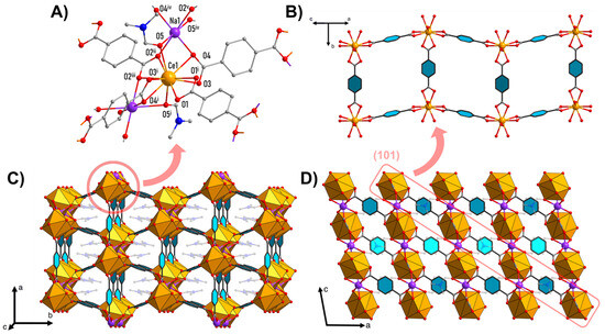 Crystal structure of Na[Ce(BDC)2(DMF)2]: cerium and sodium coordination environment (A); isolated layer structure (sodium atoms and DMF molecules are omitted for clarity) (B); packing diagram showing channels along c axis (C); packing diagram along b axis, showing layers’ arrangement in crystal (D). Color code: orange—[CeO10]; purple—Na; gray—C; red—O. DMF molecules are semi-transparent, hydrogen atoms are omitted for clarity. Symmetry codes: i—1 − x, y, 1.5 − z; ii—1 − x, −1 + y, 1.5 − z; iii—x, −1 + y, z; iv—1 − x, −y, 1 − z; v—x, 1 − y, −0.5 + z.