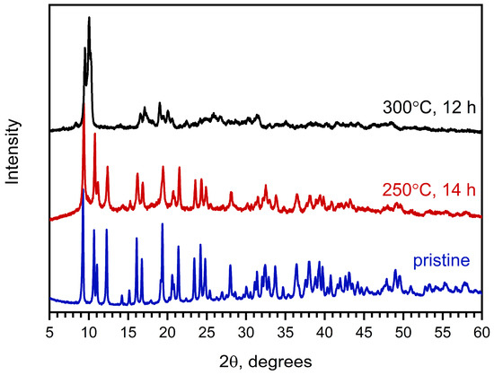PXRD patterns of as-obtained Na[Ce(BDC)2(DMF)2] (blue) and products of its activation at 250 °C for 14 h under dynamic vacuum (red) and at 300 °C under dynamic vacuum for 12 h (black).