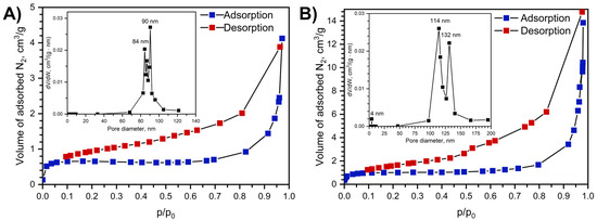 Nitrogen adsorption isotherms at 77K before (A) and after sample treatment at 250 °C for 14 h (B) and adsorption–desorption isotherms and pore size distribution, calculated with BJH model using desorption isotherm branch shown as insets.