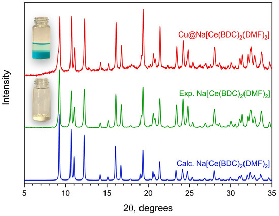 PXRD patterns of Na[Ce(BDC)2(DMF)2] before (green) and after copper impregnation (red). (Blue) line represents calculated PXRD pattern for corresponding structure.