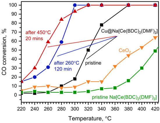 Treatment of the fresh catalyst at 450 °C for 20 min resulted in a further increase in catalytic activity (Figure 8, red). Although T100 is higher than that of the catalyst treated at 260 °C for 2 h (T100 = 320 °C vs. 300 °C), 50% conversion was achieved at approximately 250 °C, which is about 20 °C lower. This may be attributed to the activation of copper species on the catalyst surface, which results in increased low-temperature oxidative activity. On the other hand, the increase in T100 might be due to CeO2 sintering, leading to a decrease in both surface area and high-temperature catalytic activity. The activated sample demonstrates stable performance for at least 20 h (Figure S7). All investigated Cu@Na[Ce(BDC)2(DMF)2] samples exhibit higher catalytic activity in CO oxidation than commercially available CeO2.