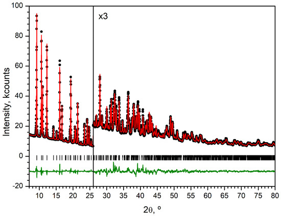 The XRD pattern (Figure 9) was indexed in the monoclinic crystal system with F30 = 117 (|Δ2θ|= 0.006°, 45 theoretical peaks) by the dichotomy method as implemented in DICVOL91 [51]. Full-profile unit-cell refinement, peak-intensity extraction using the le Bail method, and final structure refinement using the Rietveld method were performed in JANA2006 [52]. The positions of Ce, Na and O atoms were solved using the Superflip method [53]. Other atoms were found from difference Fourier syntheses. The structure was refined with soft restraints on C–C, C–O, and C–N bond lengths and the corresponding valence angles. Four isotropic atomic displacement parameters were used—for Ce, Na, non-hydrogen atoms of BDC2− and non-hydrogen atoms of DMF. Hydrogen atoms were placed in idealized positions and treated in a riding mode. The pattern was fitted with an eleven-term Chebyshev polynomial background and a five-term pseudo-Voigt shape function with asymmetry corrected by axial divergence. The details of the data collection and refinement parameters are summarized in Table 3. Figure 9 shows the refined powder XRD profile. CCDC 2,461,298 contains crystallographic information associated with this paper.