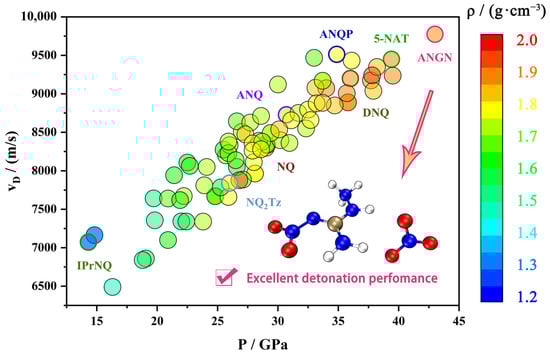 Nitroguanidine (NQ) is a high explosive known for its extremely low sensitivity to mechanical stimuli and shock waves [9,10,11]. The presence of the strongly electron-accepting nitroimine moiety makes it easily functionalized by exchanging the amine groups or substituting the hydrogen atoms of these groups. Consequently, nitroguanidine is recognized as a good building block. In addition, these groups that are both good donors and acceptors of the electron pair enable the creation of extensive networks of hydrogen bonds, which contributes to lowering the sensitivity to all types of initiating stimuli. NQ maintains insensitivity while also having high detonation performance and is therefore used as a component of gunpowder, rocket propellants, and high explosives. Figure 1 shows the density, detonation velocity, and pressure of NQ and its 85 derivatives [11,12]. There are many great derivatives, such as 1-amino-2-nitroguanidine (ANQ), with surprisingly abundant reactivity; 1-amino-2-nitroguanidium pentazolate (ANQP) [13], with almost the highest density within the non-metallic pentazolate salts; and 1-amino-2-nitroguanidinium nitrate (ANGN), with almost the highest detonation velocity and pressure (VD = 9775 ms−1, P = 43.0 GPa) among the derivatives of NQ, making it promising for application in gun propellants [14].