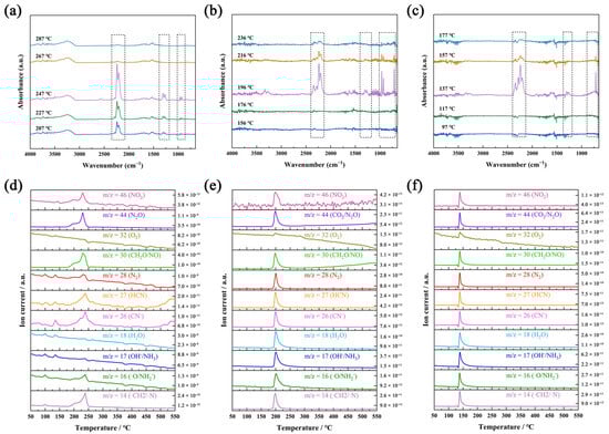 Infrared spectra at different heating temperatures of gas-phase products from the decomposition of NQ (a), ANQ (b), and ANGN (c). Ion current intensity of NQ (d), ANQ (e), and ANGN’s (f) gas-phase product with temperature changes.