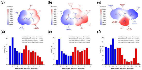 ESP-mapped molecular vdW surfaces of NQ (a), ANQ (b), and ANGN (c). The area distribution maps of ESP for NQ (d), ANQ (e), and ANGN (f).