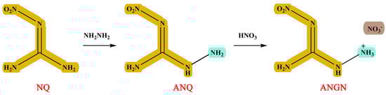 1-Amino-2-nitroguanidine (ANQ) and 1-amino-2-nitroguanidinium nitrate (ANGN) were synthesized using Scheme 1. They have been documented in the literature and were fully characterized by infrared and NMR spectra [18].