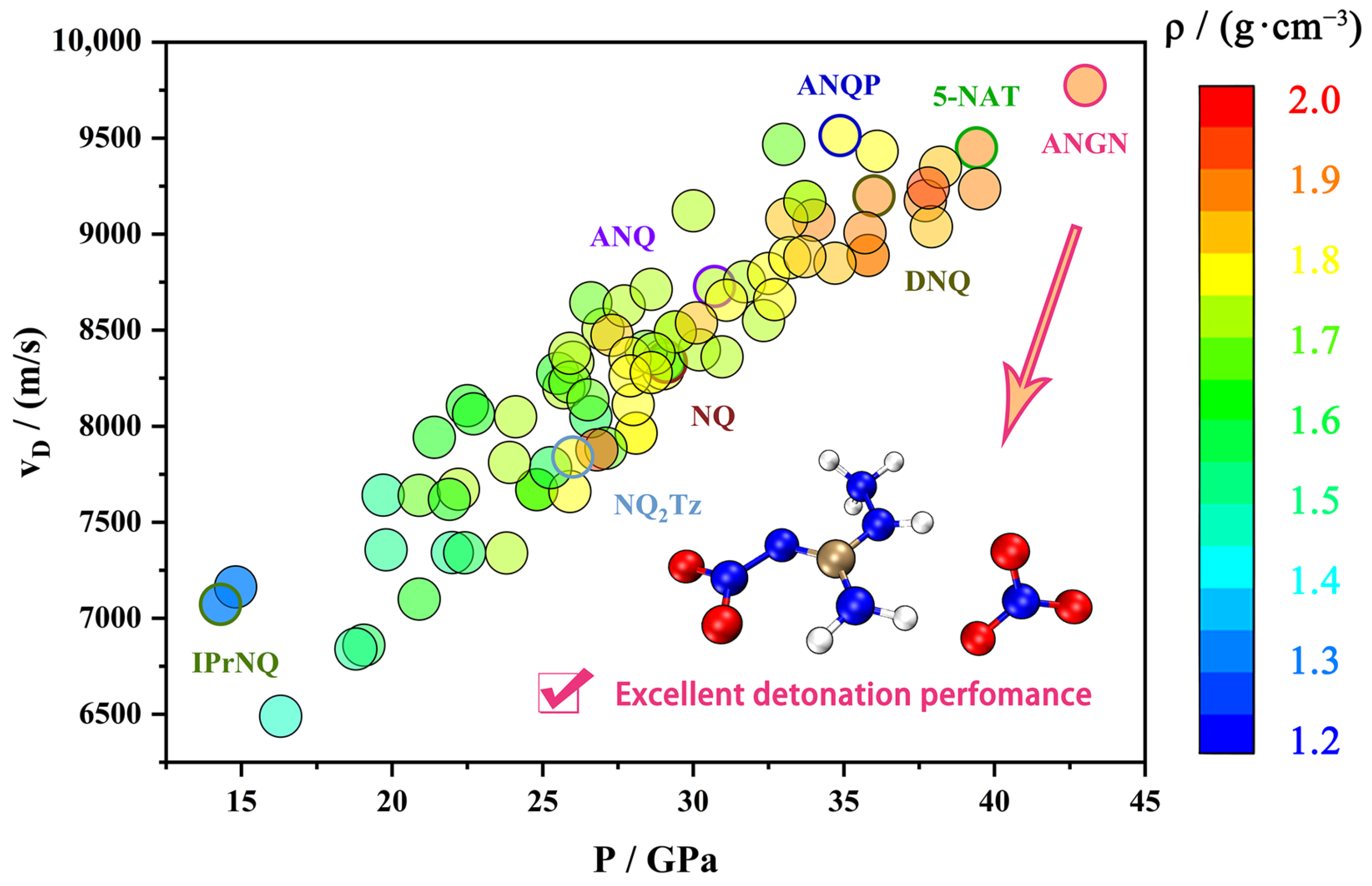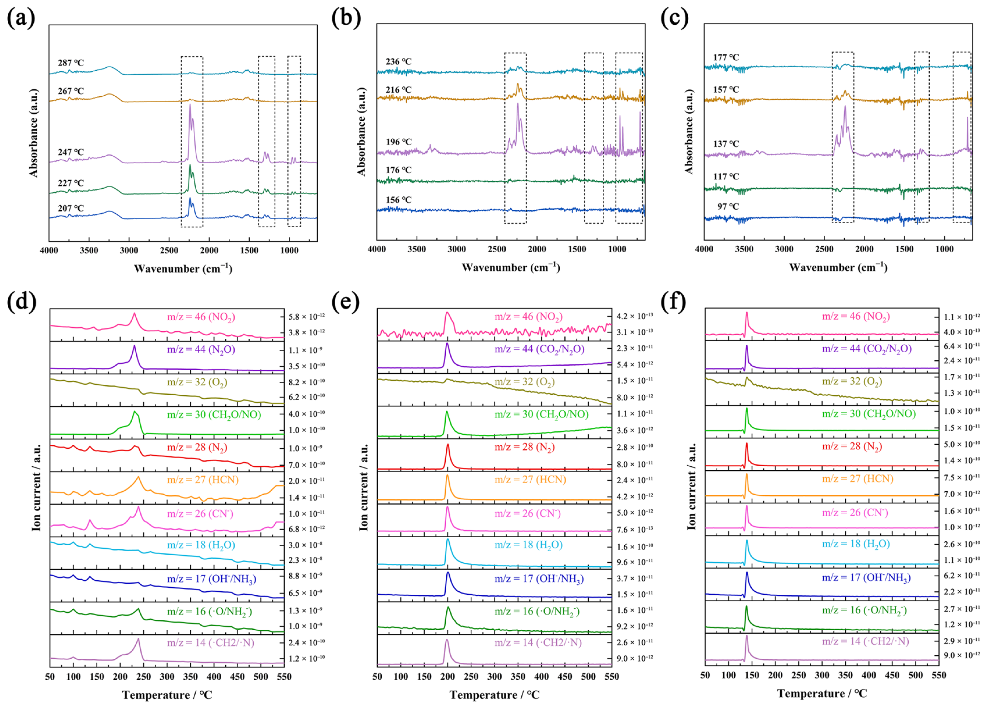 - LOL- analysis reveals that the order of molecular conjugation strength is ANQ > NQ > ANGN due to the differences in the electronic effects of introduced groups, which aligns with the trend in N–NO2 bond dissociation energy and the corresponding yield of NO2 during decomposition. Furthermore, the trend in HOMO-LUMO gaps (NQ > ANQ > ANGN) successfully explains the thermal behavior: a larger gap can lead to a higher decomposition temperature.