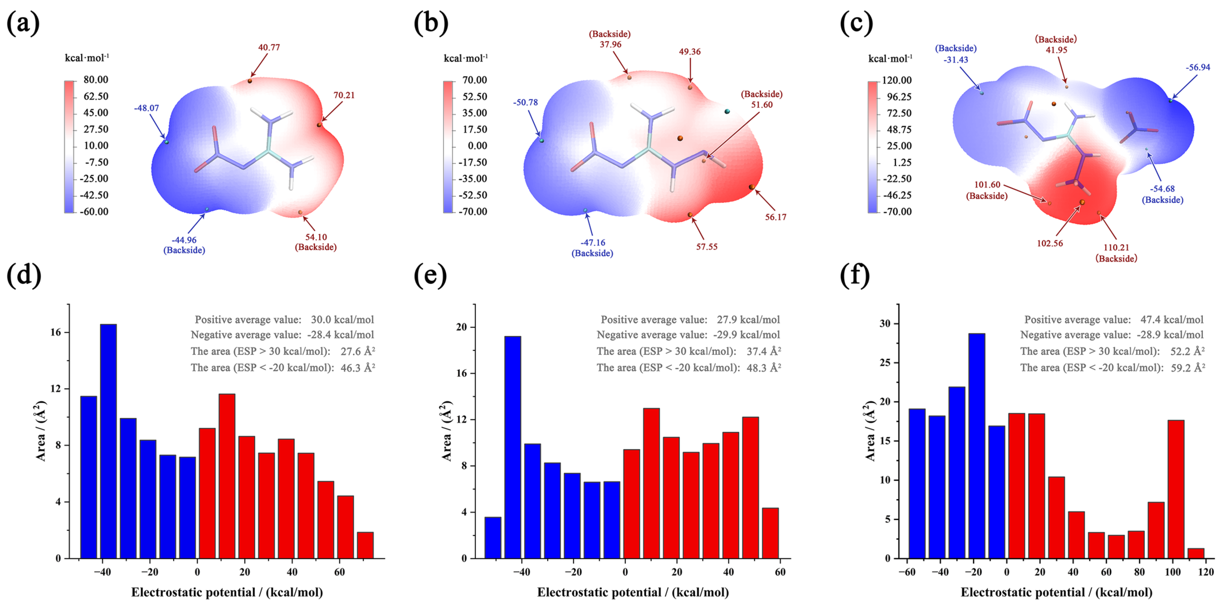 - The distribution of electrostatic potential of ANQ and ANGN becomes more inhomogeneous due to the introduction of -NH2 groups and NO3− anions, resulting in an increase in sensitivity. Furthermore, the frequency of O···O contacts and the strength of the hydrogen bonding network are also closely consistent with the experimental sensitivity order: ANGN ANQ NQ.