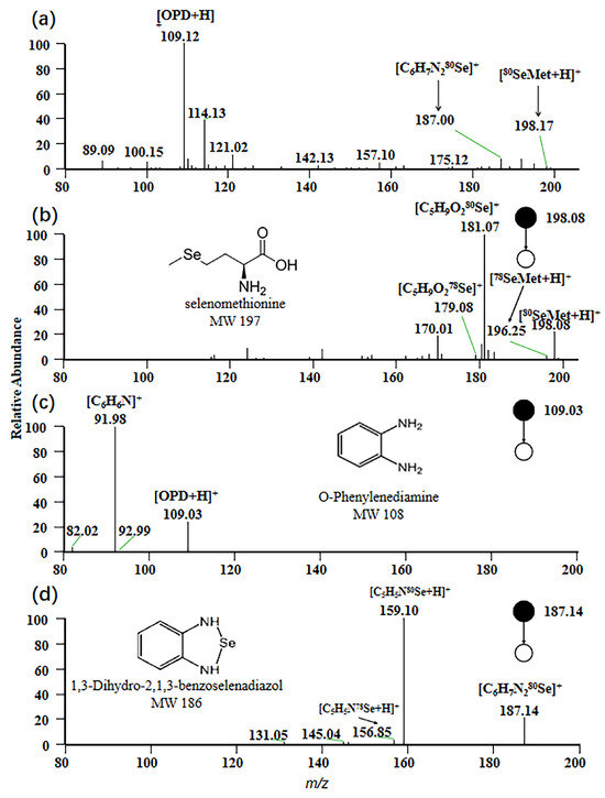 For EESI-MS, the positive ion mode was selected to obtain a characteristic fragmentation pattern. In this study, the mass spectrum of a standard mixed solution with a concentration of 1 ppm is depicted in Figure 1a. A peak signal at m/z 198 was observed, corresponding to the adduct ion [80SeMet + H]+, which represents the protonated form of selenomethionine with a molecular weight of 197 Da. At m/z 109, a peak signal corresponding to the protonated form [OPD + H]+ of OPD under positive ion mode was generated, while the adduct ion [C6H6N280Se + H]+ with m/z 187 was observed, resulting from the protonated form of 1,3-dihydro-2,1,3-benzisoselenazole formed by the reaction of OPD with sodium selenite in the sample.