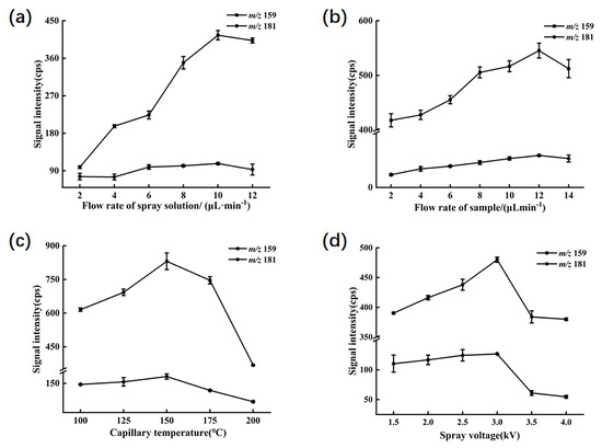 As depicted in Figure 2b, the signal intensities for m/z 159 and m/z 181 consistently increased within the sample flow rate range of 2 to 12 µL/min, reaching their peak responses at a flow rate of 12 µL/min. This indicates that a flow rate of 12 µL/min within the range of 2 to 14 µL/min provides optimal conditions for detecting target ions in the sample.