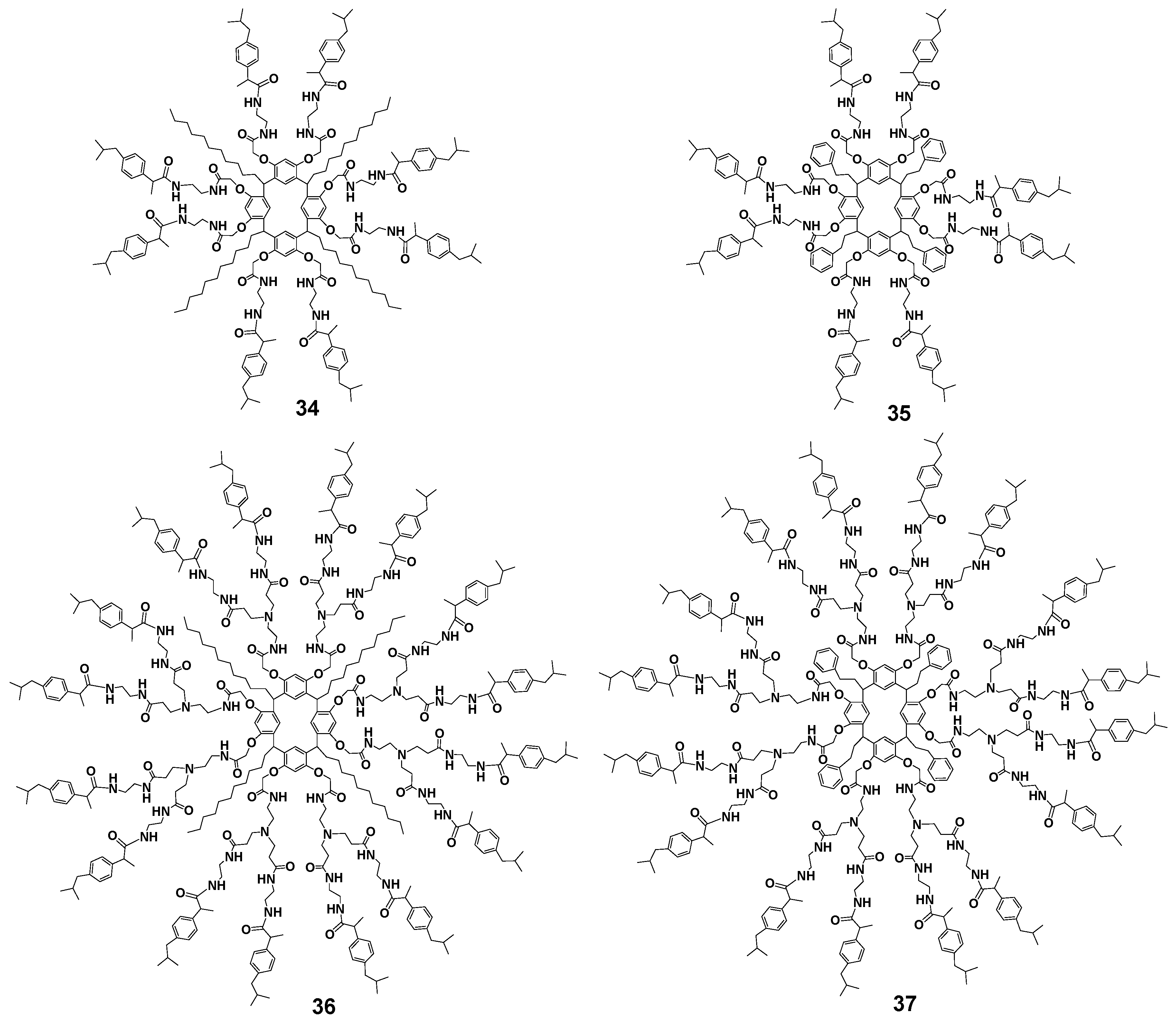 - Pedro-Hernández, L.D.; Martínez-Klimova, E.; Cortez-Maya, S.; Mendoza-Cardozo, S.; Ramírez-Ápan, T.; Martínez-García, M. Synthesis, Characterization, and Nanomedical Applications of Conjugates between Resorcinarene-Dendrimers and Ibuprofen. Nanomaterials 2017, 7, 163. [Google Scholar] [CrossRef]