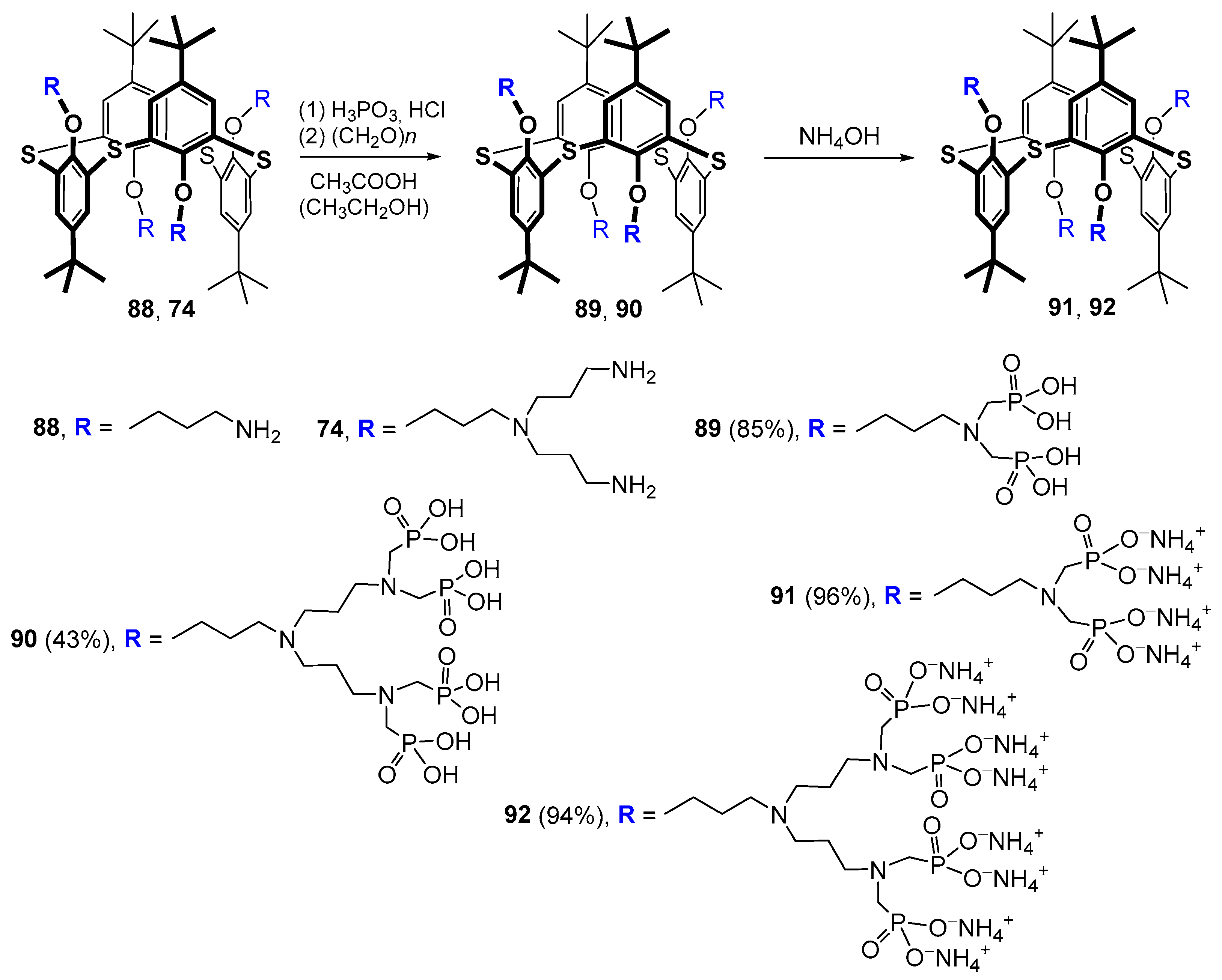 - Shibaeva, K.S.; Nazarova, A.A.; Kuznetsova, D.I.; Stoikov, I.I. Synthesis of aminobismethylenephosphonic acids on a platform of p-tert-Butylthiacalix[4]arene in 1,3-alternate configuration. Rus. J. Gen. Chem. 2016, 86, 579–583. [Google Scholar] [CrossRef]