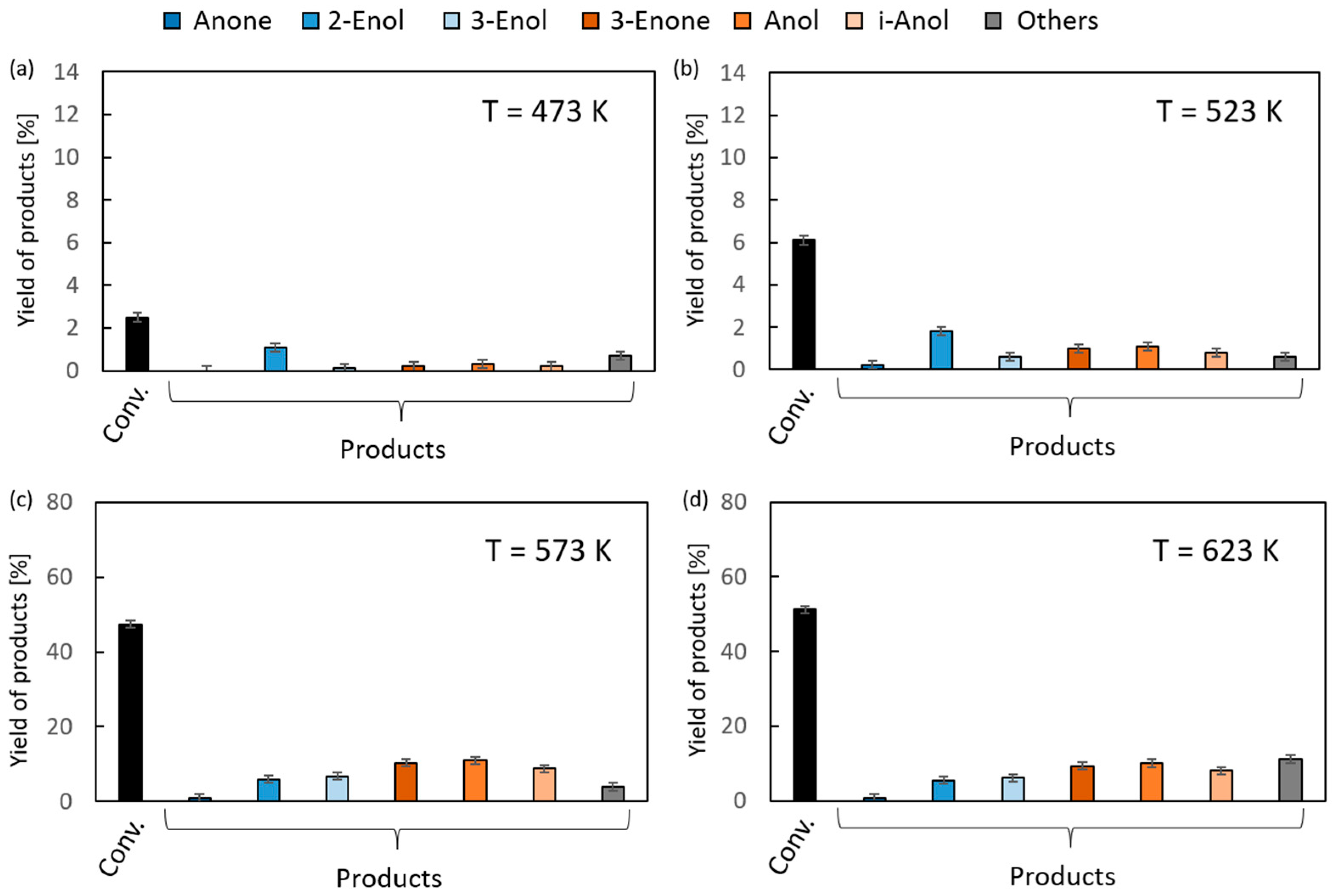 | Time [min] | Conv. [%] | Yields of Products [%] | |||