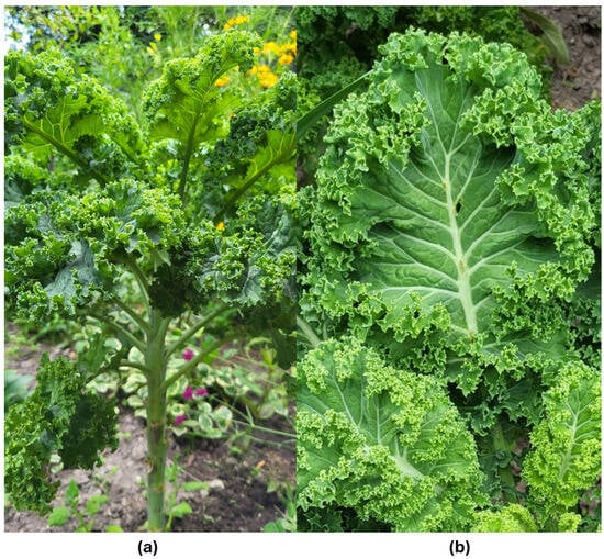 Kale can be divided into at least three groups based on origin: curly kale, collard kale, and Italian kale. Curly kale (Scottish type, Brassica oleracea convar. acephala var. sabellica) is mainly grown in Northern Europe and is considered an example of an ideal kale. Italian kale (Italian variety, Lacinato type, Brassica oleracea convar. acephala var. palmifolia) was originally cultivated in Tuscany and is characterized by dark green leaves with a wavy edge. Collard (Brassica oleracea convar. acephala var. viridis) occurs mainly in the southern United States and is characterized by large, flat, round leaves that resemble wild cabbage. Russian kale (Russian kale, Siberian type, Brassica napus var. pabularia) can also be distinguished. Despite the wide distribution of plants and their morphological diversity of kale, there has not been much scientific research on this plant [17]. The name ‘kale’ usually refers to the species B. oleracea var. acephala, but it also includes other market classes such as B. napus var. pabularis (Russian-Siberian kale), B. oleracea var. alboglabra (Chinese kale), and some varieties of B. oleracea var. viridis (collard greens) [18]. The division of kale varieties with examples and morphological features is presented in Table 1.