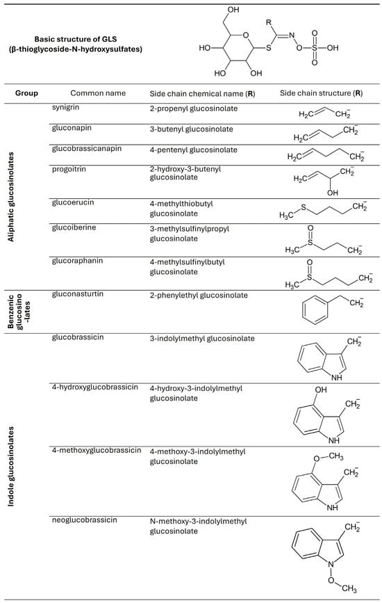 Fresh kale contains from 2.25 to 93.90 μmol/g dry weight (DW) glucosinolates, but their concentration varies depending on the region of the world from which it comes. The GLS content in vegetables depends on temperature, the presence of pathogens, soil fertility, and the amount of sulfur, nitrogen, and water in the substrate [33]. Studies show that GLS production in kale is induced by damage and wounds, which can be caused by diseases and insects. Figure 2 shows the GLS found in kale [2,7,34].