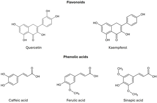 Chemical structure of flavonoids and phenolic acids found in Brassica oleracea var. acephala (according to Šamec et al., 2019 [2]).