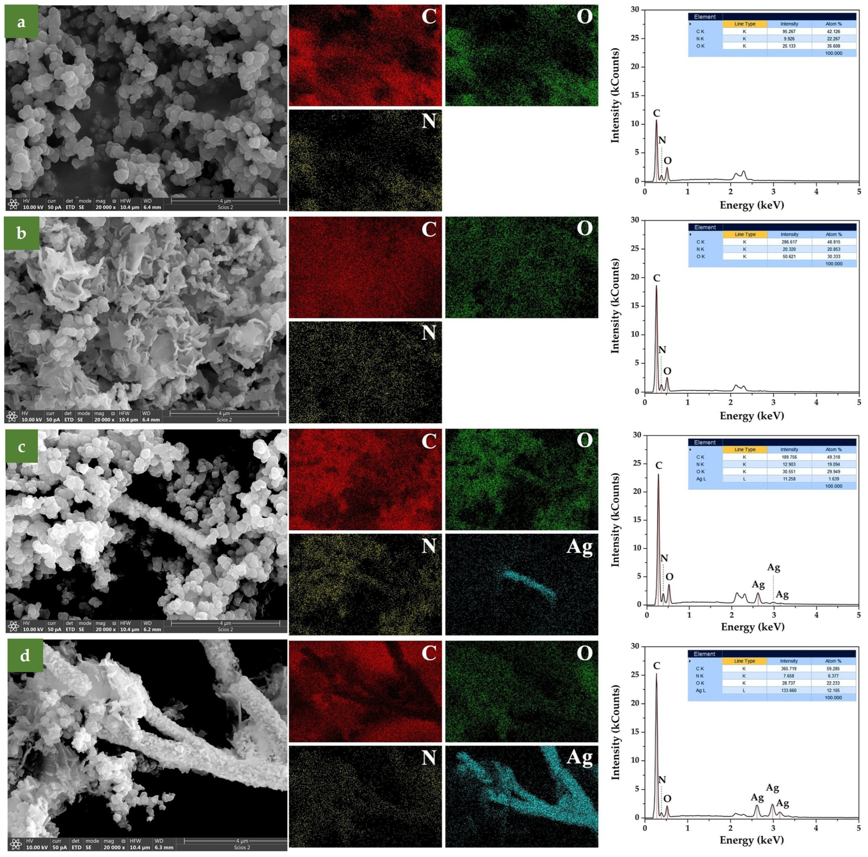 SEM micrographs of all synthesized samples are shown in Figure 1. To verify the chemical composition of the examined samples, elemental mapping was performed using EDS. The results are presented in Figure 2, along with the corresponding spectra, shown in the 0 to 5 keV energy range for better clarity. In the elemental maps, different colors were assigned to each element to emphasize their spatial distribution: carbon (C) in red, oxygen (O) in green, nitrogen (N) in yellow, and silver (Ag) in cyan.