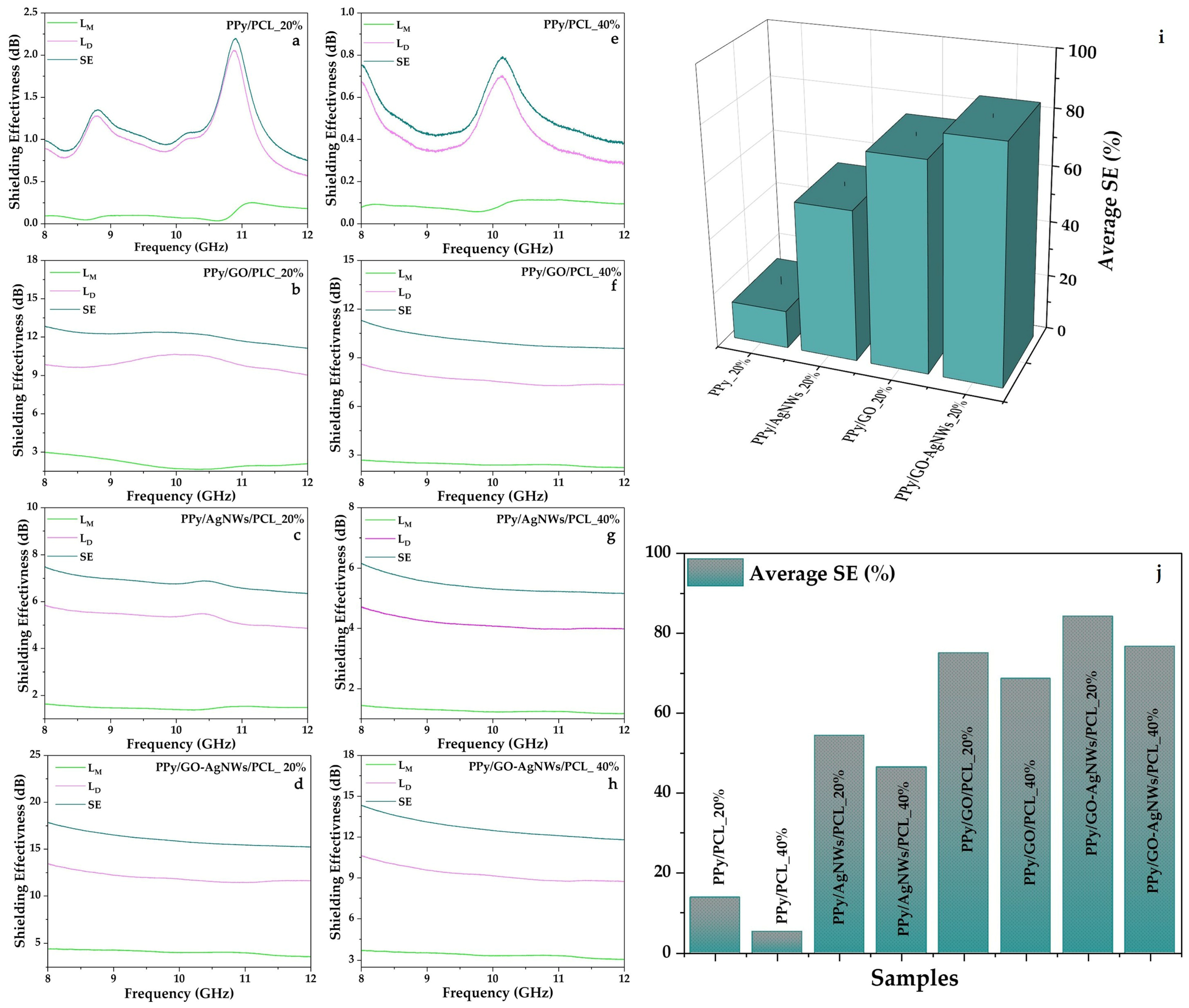 EMI shielding tests in the X-band (8–12 GHz) showed that neat PPy/PCL had low effectiveness, while adding GO and AgNWs significantly improved performance. The highest shielding was observed in ternary PPy/GO–AgNWs/PCL_20 wt% composites, with an average SE of 16.05 dB, indicating 84.4% attenuation of incident electromagnetic waves. Dissipation loss was the primary mechanism, although mismatch loss became more significant in ternary systems.