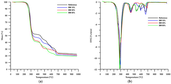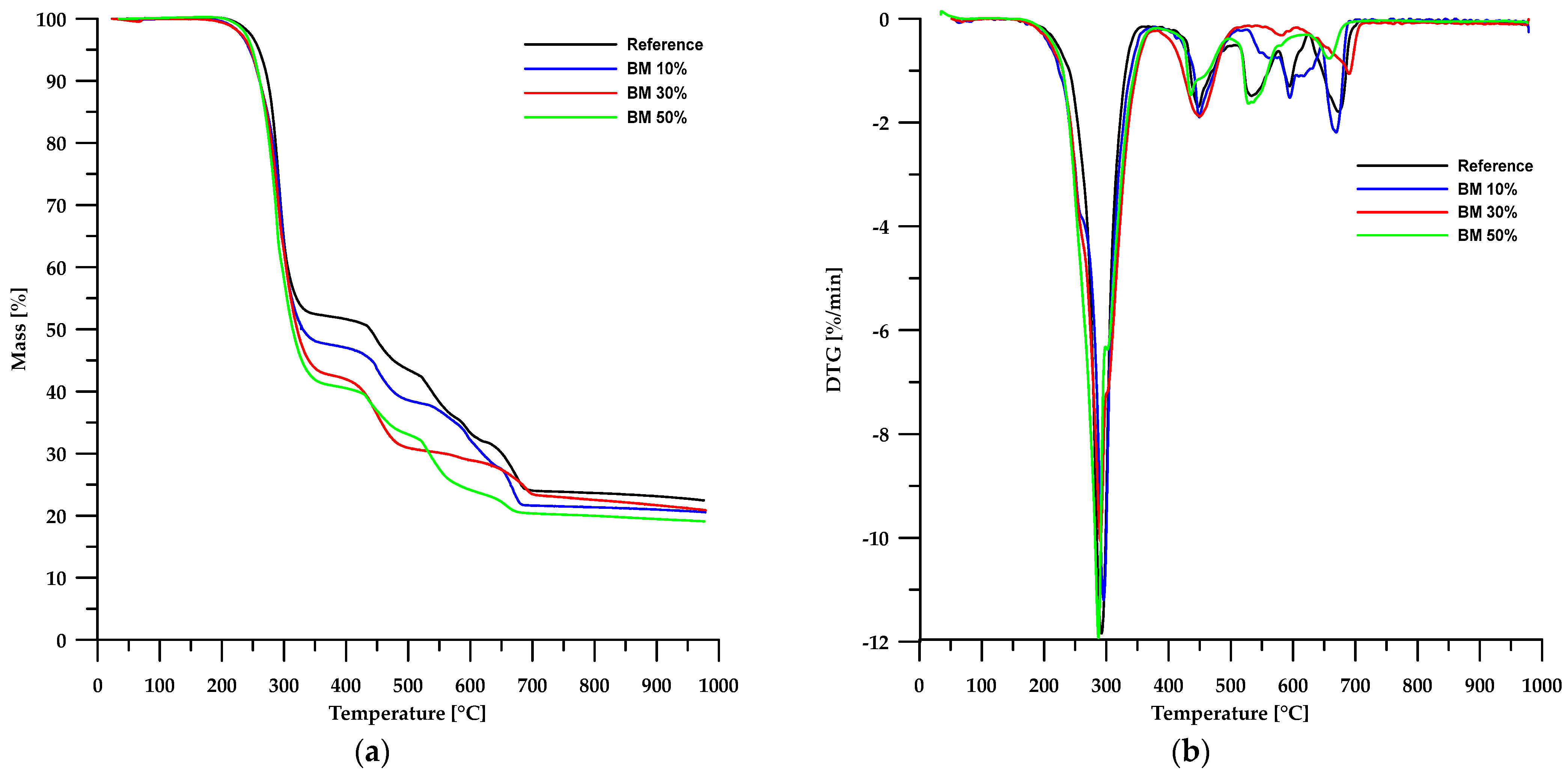 | Sample | T1 1 (°C) | T5 2 (°C) | Tmax 3 (°C) | Residual Mass (%) |