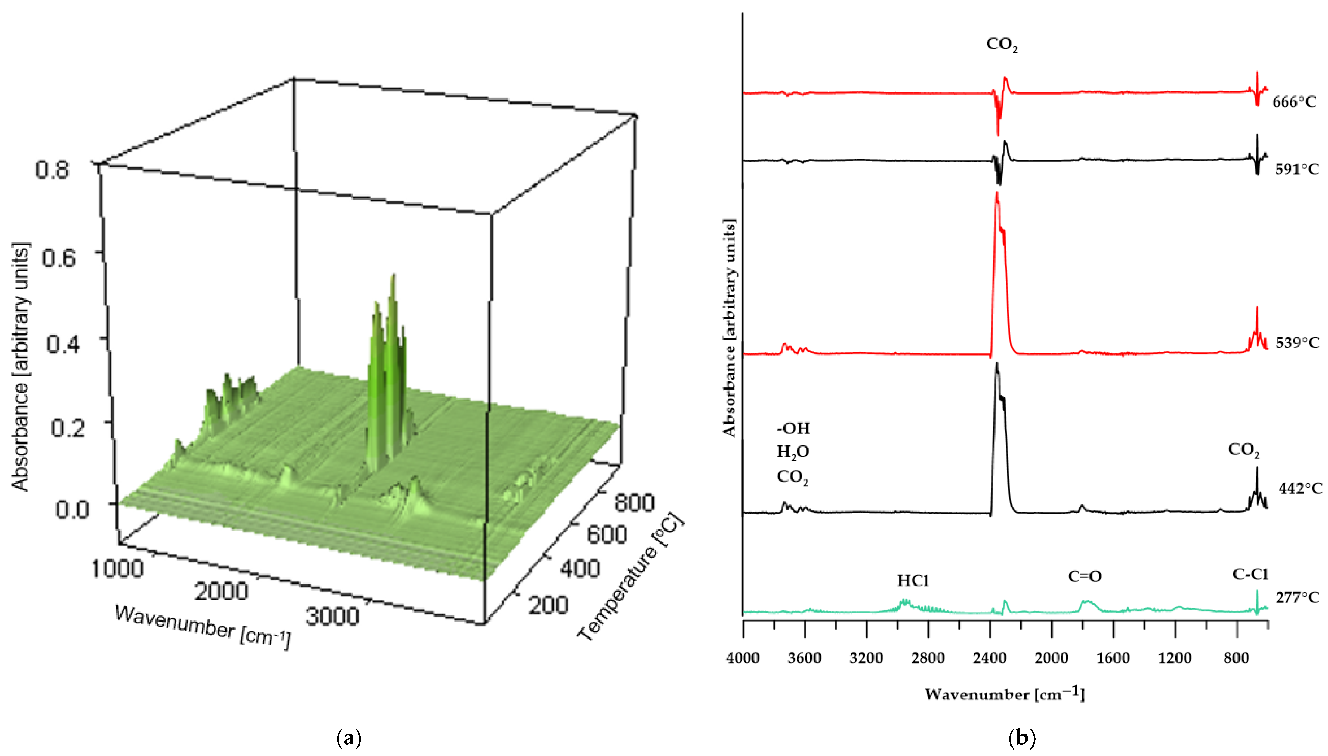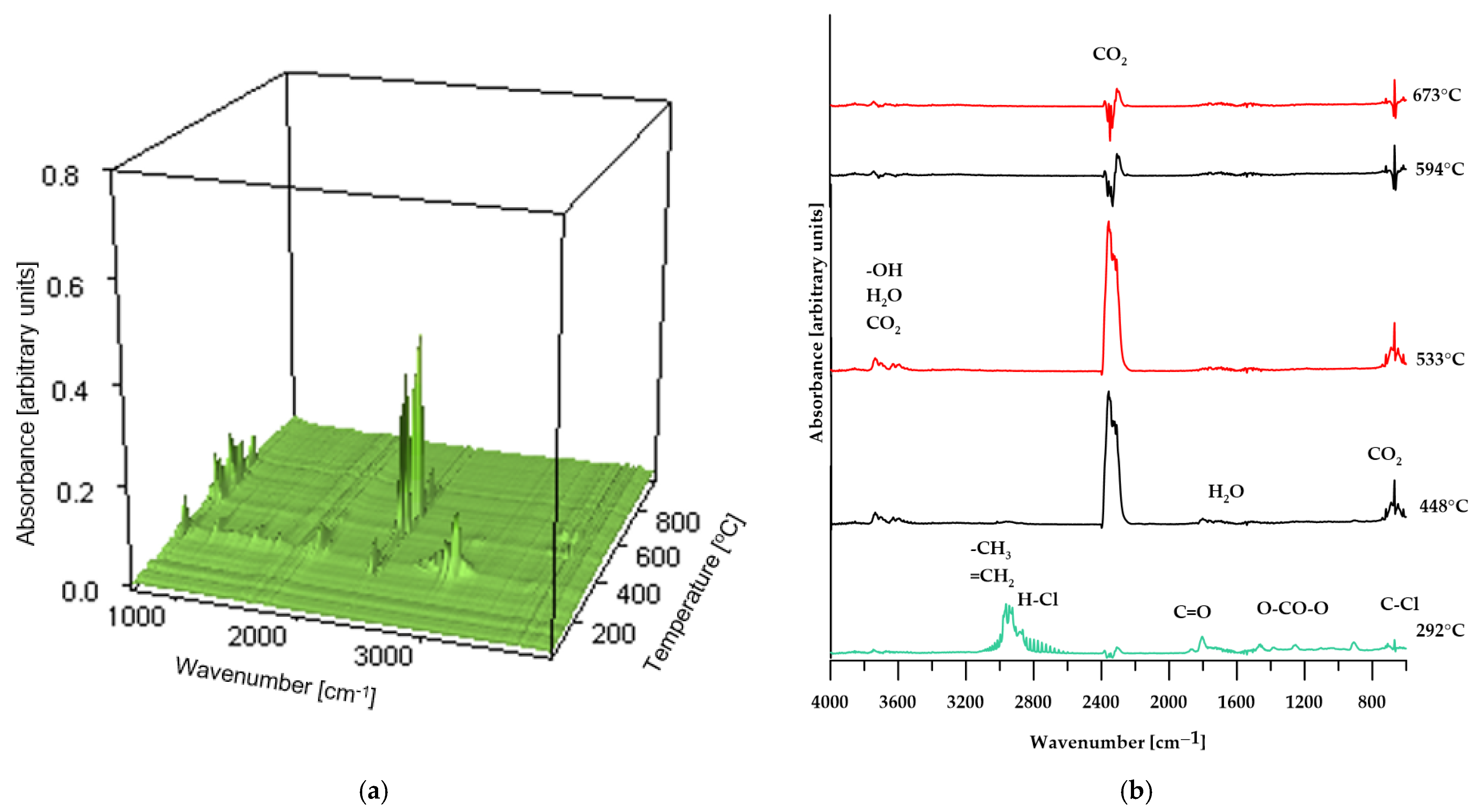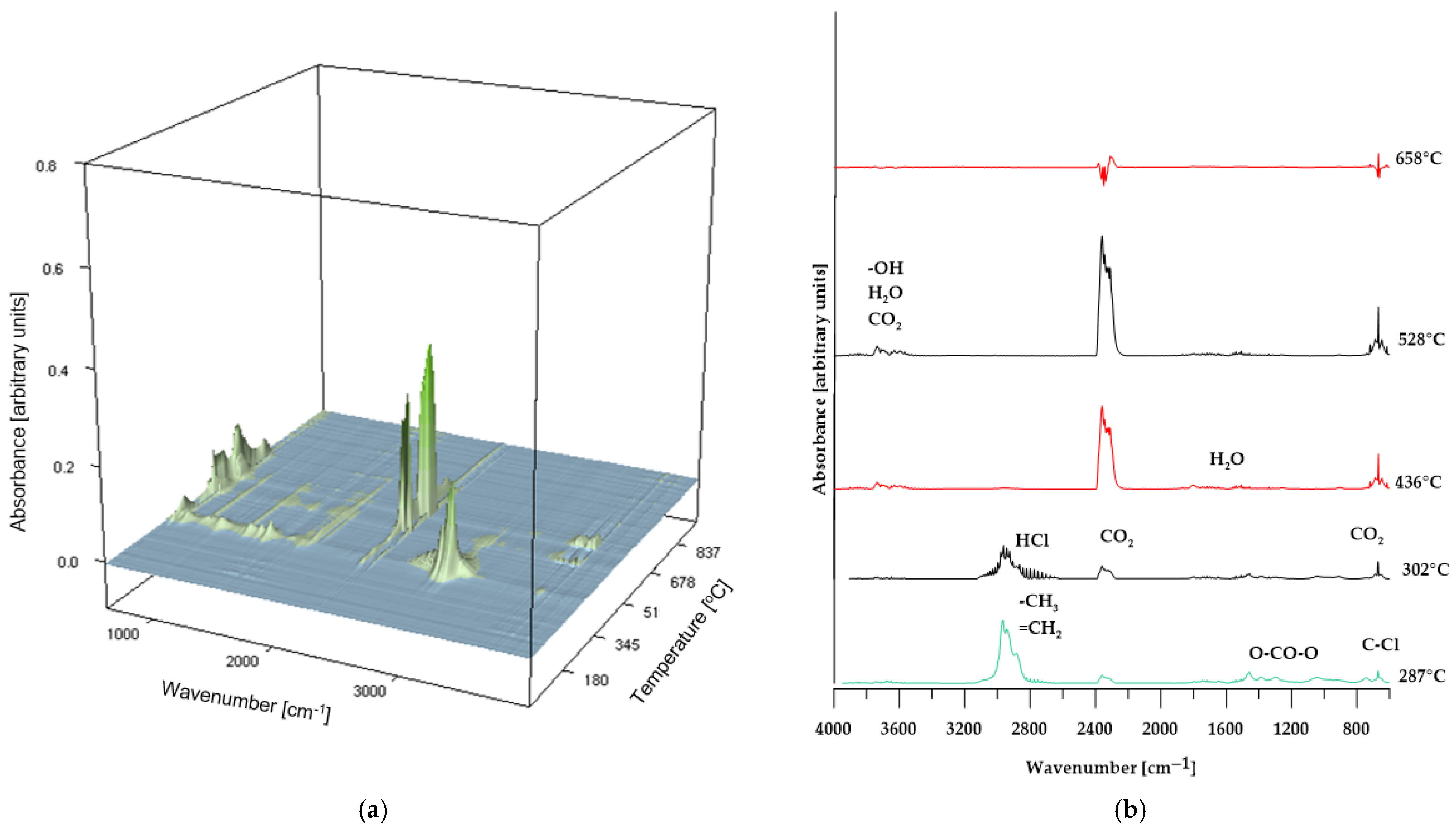 - Zhou, J.; Liu, G.; Wang, S.; Zhang, H.; Xu, F. TG-FTIR and Py-GC/MS Study of the Pyrolysis Mechanism and Composition of Volatiles from Flash Pyrolysis of PVC. J. Energy Inst. 2020, 93, 2362–2370. [Google Scholar] [CrossRef]