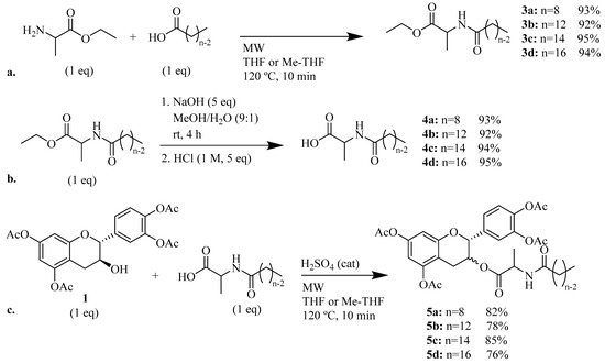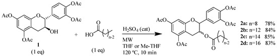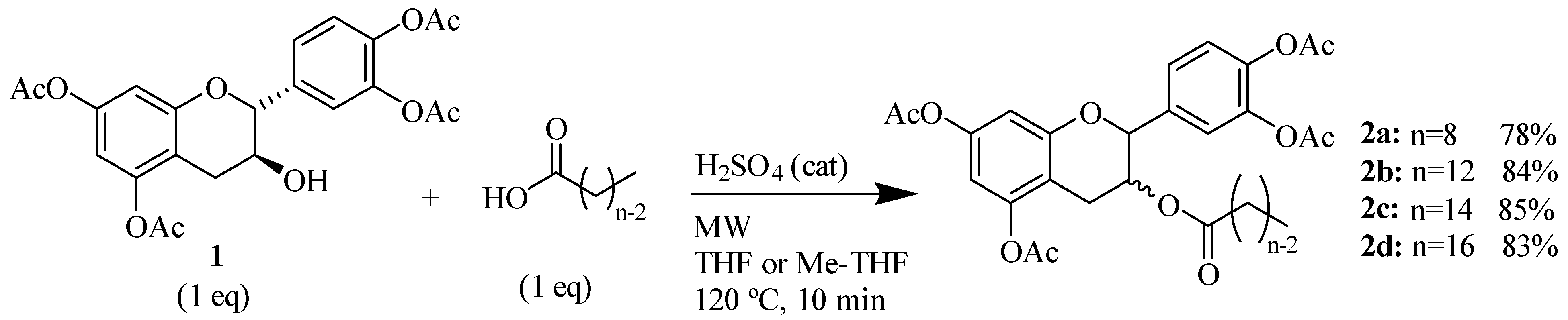 Compound 1 (0.5 g, 1.09 mmol, 1 equivalent) and one equivalent of fatty acid were dissolved in 10 mL of anhydrous THF or anhydrous Me-THF. Concentrated H2SO4 (50 μL, 0.92 mmol) has been added and the mixture has been agitated in a microwave at 120 °C for 10 min using a power of 100 W. Ethyl acetate (100 mL) has been added and washed successively with 25 mL of saturated NaHCO3 until neutral pH of the aqueous phase and with 25 mL of saturated NaCl. The organic phase was dried over anhydrous MgSO4, filtered and evaporated.