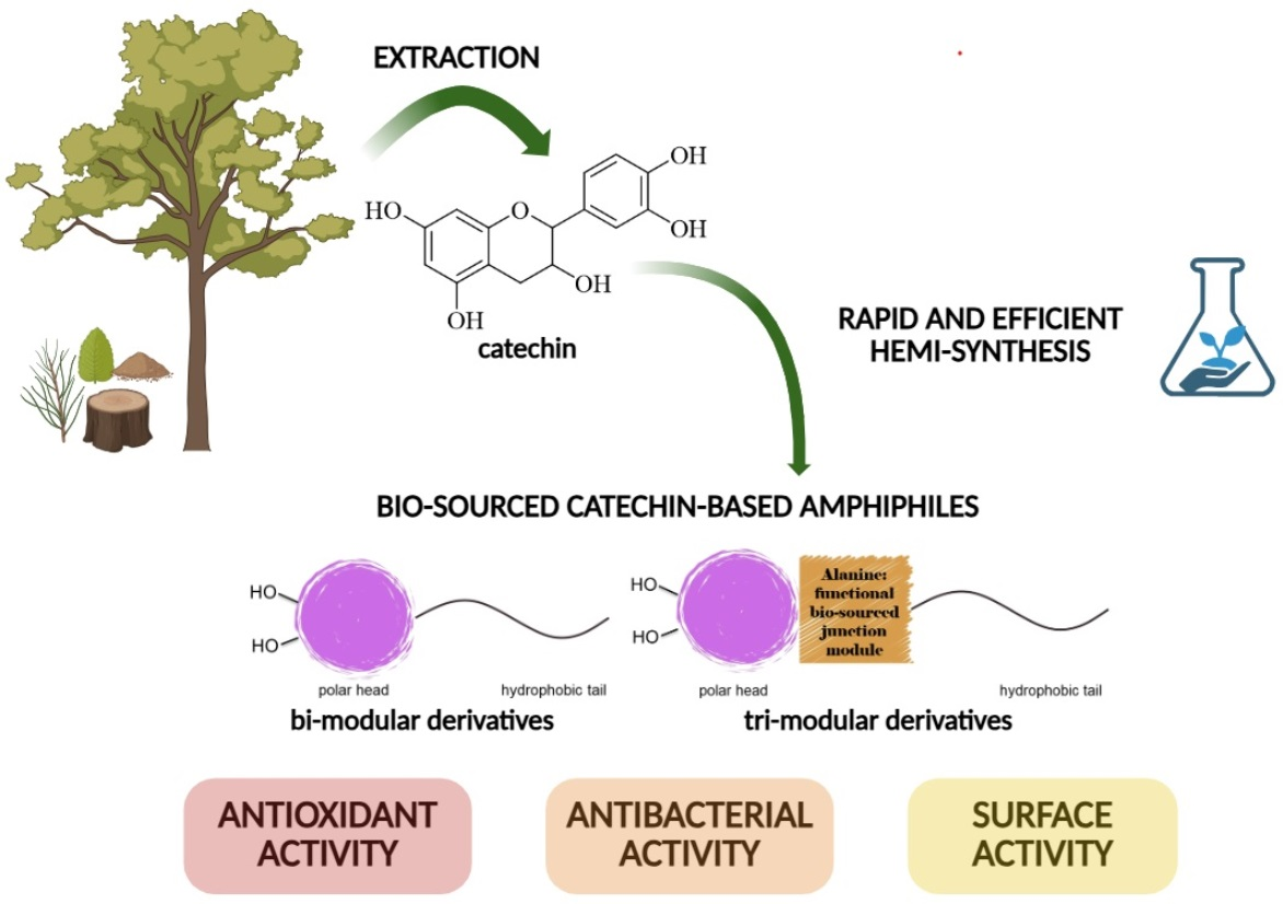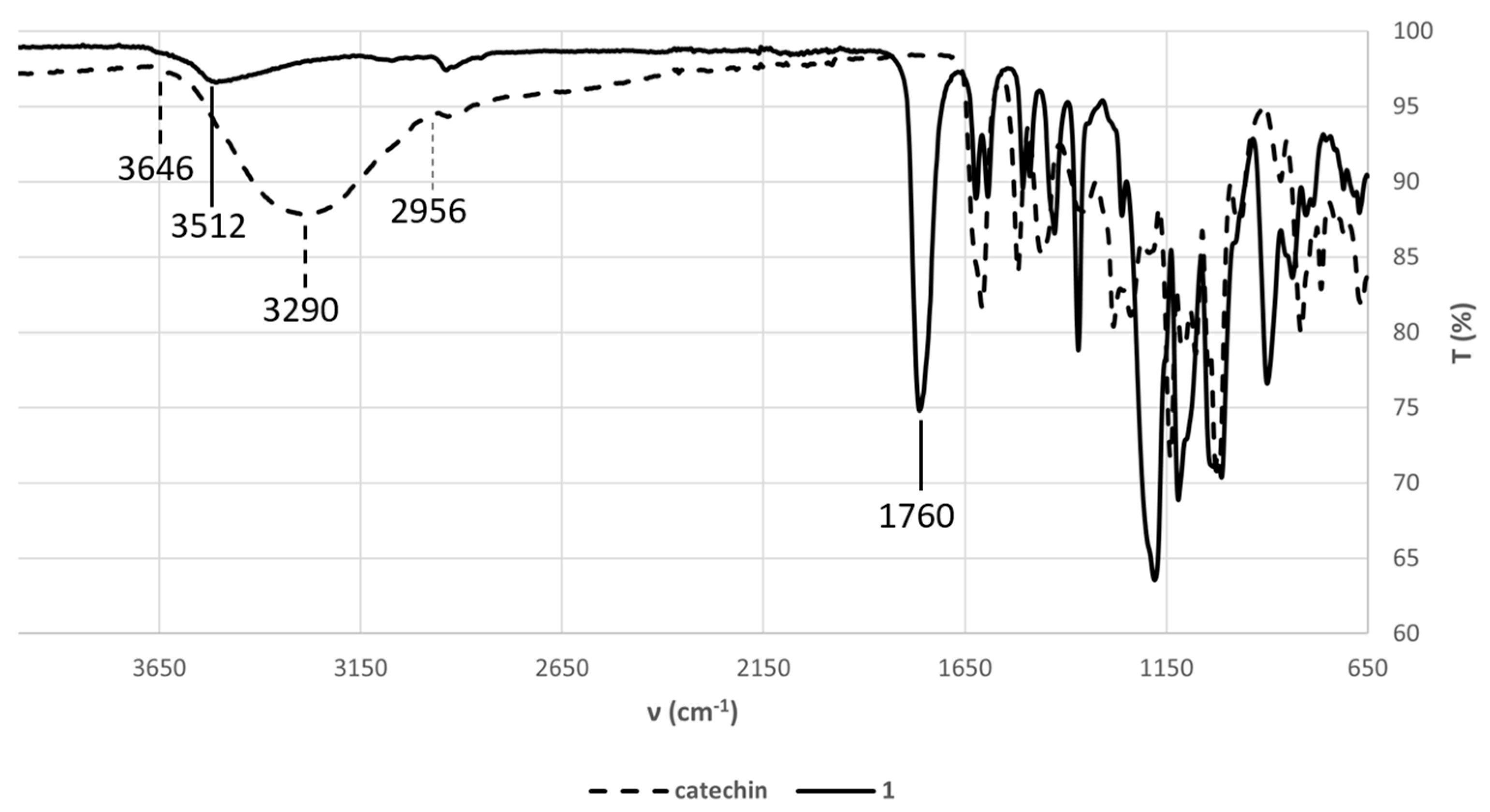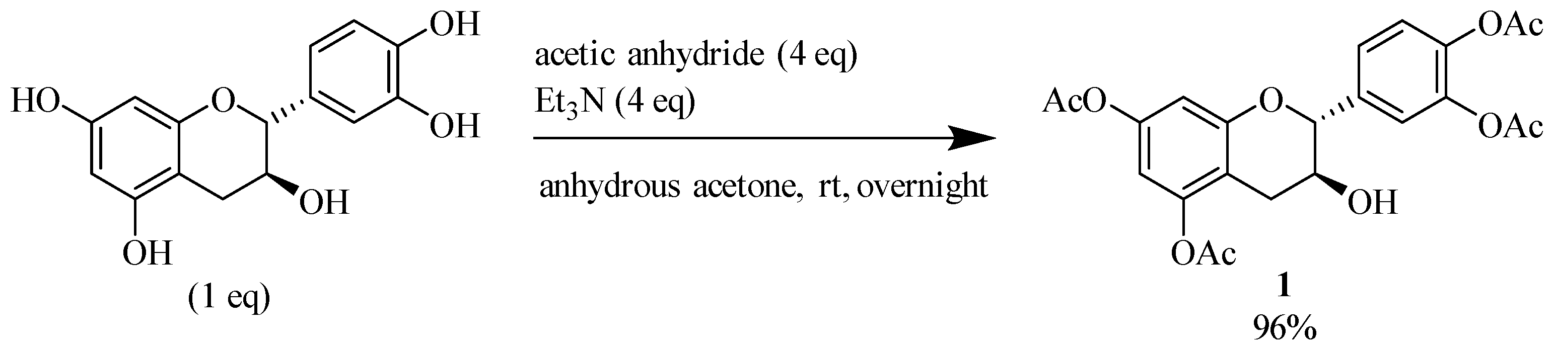 Previously dried, commercially obtained (+)-catechin (4 g, 13.78 mmol, 1 equivalent) was dissolved in anhydrous acetone (80 mL). Acetic anhydride (5.63 g, 55.12 mmol, 4 equivalents) and then Et3N (5.58 g, 55.12 mmol, 4 equivalents) were added dropwise. The mixture was stirred at room temperature overnight. Acetone was evaporated under low pressure and CH2Cl2 (100 mL) was added. The organic phase was washed with saturated NaHCO3 (25 mL) until neutral pH of the aqueous phase obtained. Organic phase was dried on anhydrous MgSO4 and the solvent was evaporated under low pressure. The residue has been purified by recrystallization in water.