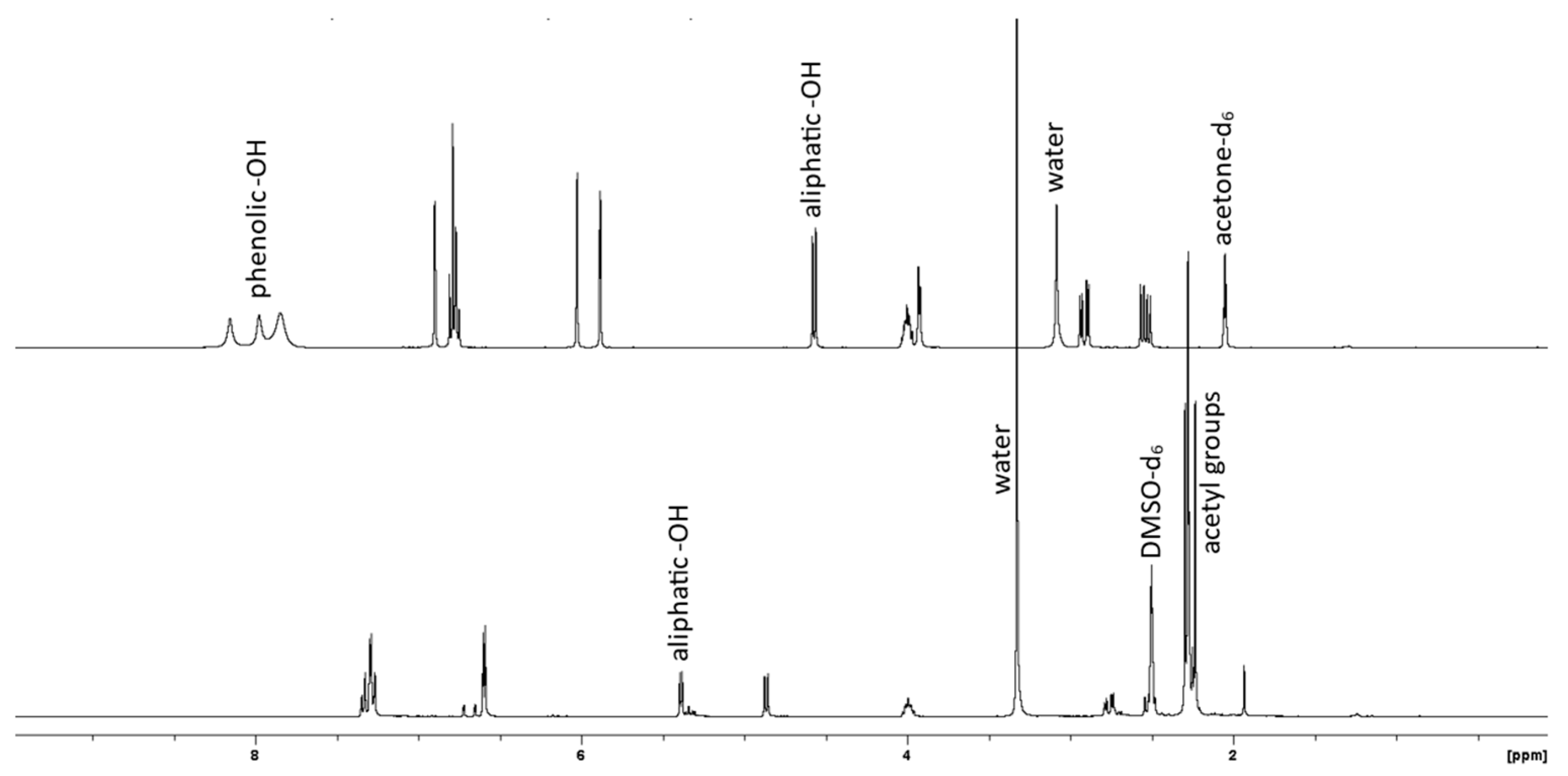 4-(5,7-Diacetoxy-3-hydroxychroman-2-yl)-1,2-phenylene diacetate (1). C23H22O10. Light orange solid. Yield: 96% (6.06 g). 1H-NMR (400 MHz, DMSO-d6): δ (ppm) = 2.20 (s, 3H, H-17), 2.24 (s, 6H, H-19, H-23), 2.26 (s, 3H, H-21), 2.48 (dd, J = 16, 9 Hz, 1H, H-7α), 2.74 (dd, J = 16, 5 Hz, 1H, H-7β), 3.92–4.00 (m, 1H, H-8), 4.83 (d, J = 8 Hz, 1H, H-9), 5.37 (d, J = 5 Hz, H-24), 6.56 (d, J = 2 Hz, 1H, H-2), 6.58 (d, J = 2 Hz, 1H, H-6), 7.23–7.33 (m, 3H, H-11, H-14, H15). 13C-NMR (100 MHz, DMSO-d6): δ (ppm) = 20.7 (C-17), 20.9 (C-19, C-23), 21.2 (C-21), 28.5 (C-7), 65.5 (C-8), 80.9 (C-9), 107.8 (C-6), 109.1 (C-2), 112.5 (C-4), 122.8 (C-15), 123.8 (C-14), 126.0 (C-11), 138.0 (C-10), 142.1 (C-13), 142.2 (C-12), 149.7 (C-1, C-3), 155.0 (C-5), 168.8 (C-16), 169.1 (C-18, C-22), 169.5 (C-20). IR: ν (cm−1) = 1760 (C=O acetyl), 3512 (-OH aliphatic).