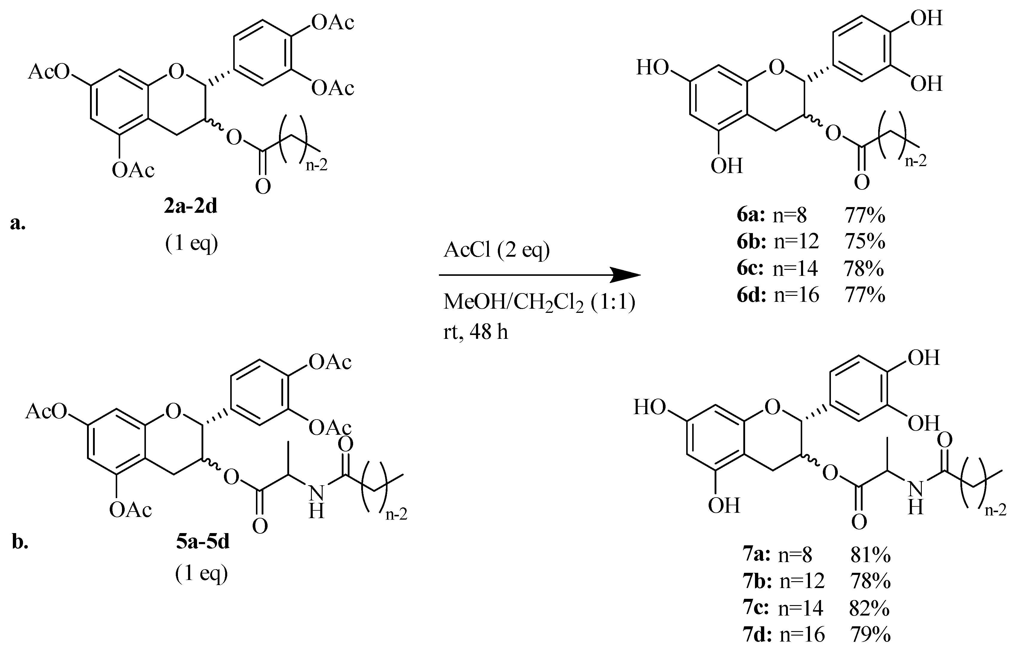 2-(3,4-Dihydroxyphenyl)-5,7-dihydroxychroman-3-yl octanoylalaninate (7a). Whitish solid. Yield: 81% (0.256 g). m.p. 120 °C. Anal. Calculated for C26H33NO8: C, 64.05; H, 6.82; N, 2.87; Found: C, 64.17; H, 6.80; N, 2.84. 1H-NMR (400 MHz, DMSO-d6): δ (ppm) = 0.94 (t, J = 7 Hz, 3H, H-31), 1.31–1.39 (ma, 8H, H-27-30), 1.40 (d, J = 7 Hz, 3H, H-22), 1.65 (q, J = 7 Hz, 2H, H-26), 2.26 (t, J = 7 Hz, 2H, H-25), 2.51–2.59 (m, 1H, H-7α), 2.85–2.94 (dd, J = 16, 6 Hz, 1H, H-7β), 3.98–4.05 (m, 1H, H-8), 4.43 (q, J = 7 Hz, 1H, H-21), 4.61 (d, J = 8 Hz, 1H, H-9), 5.90 (d, J = 2 Hz, 1H, H-2), 5.97 (d, J = 2 Hz, 1H, H-6), 6.74–6.84 (ma, 3H, H-11, H-14, H-15) 6.88 (d, J = 6Hz, 1H, H-23), 8.84 (s, 1H, H-16), 8.86 (s, 1H, H-17), 8.98 (s, 1H, H-19), 9.21 (s, 1H, H-18). 13C-NMR (100 MHz, MeOD): δ (ppm) = 14.4 (C-31), 17.3 (C-22), 23.7 (C-30), 26.9 (C-7), 28.5 (C-29), 30.2 (C-28), 30.4 (C-27), 33.0 (C-26), 36.6 (C-25), 52.5 (C-21), 68.8 (C-8), 82.9 (C-9), 94.9 (C-2), 95.5 (C-6), 100.0 (C-4), 115.2 (C-14), 115.8 (C-15), 120.0 (C-11), 131.5 (C-10), 146.2 (C-12-13), 156.9 (C-1), 157.9 (C-3), 170.2 (C-20), 174.9 (C-24). IR: ν (cm−1) = 2996–3677 (-OH), 3315 (N-H amide), 1725 (C=O ester), 1642 (C=O amide).