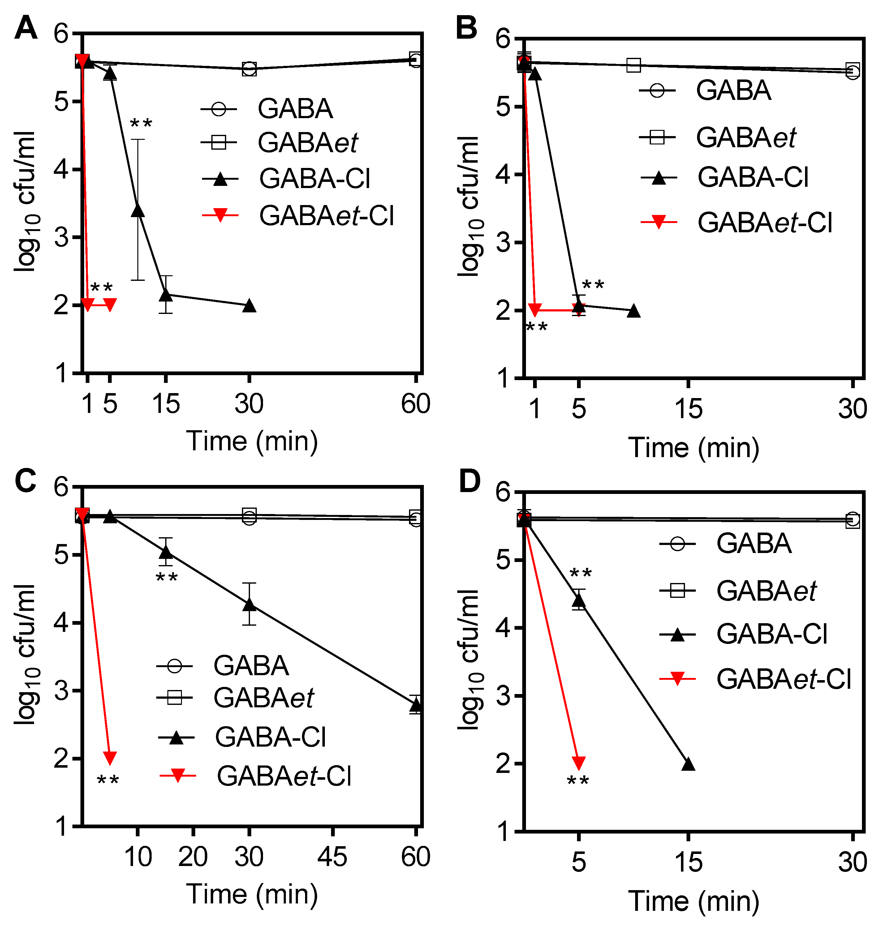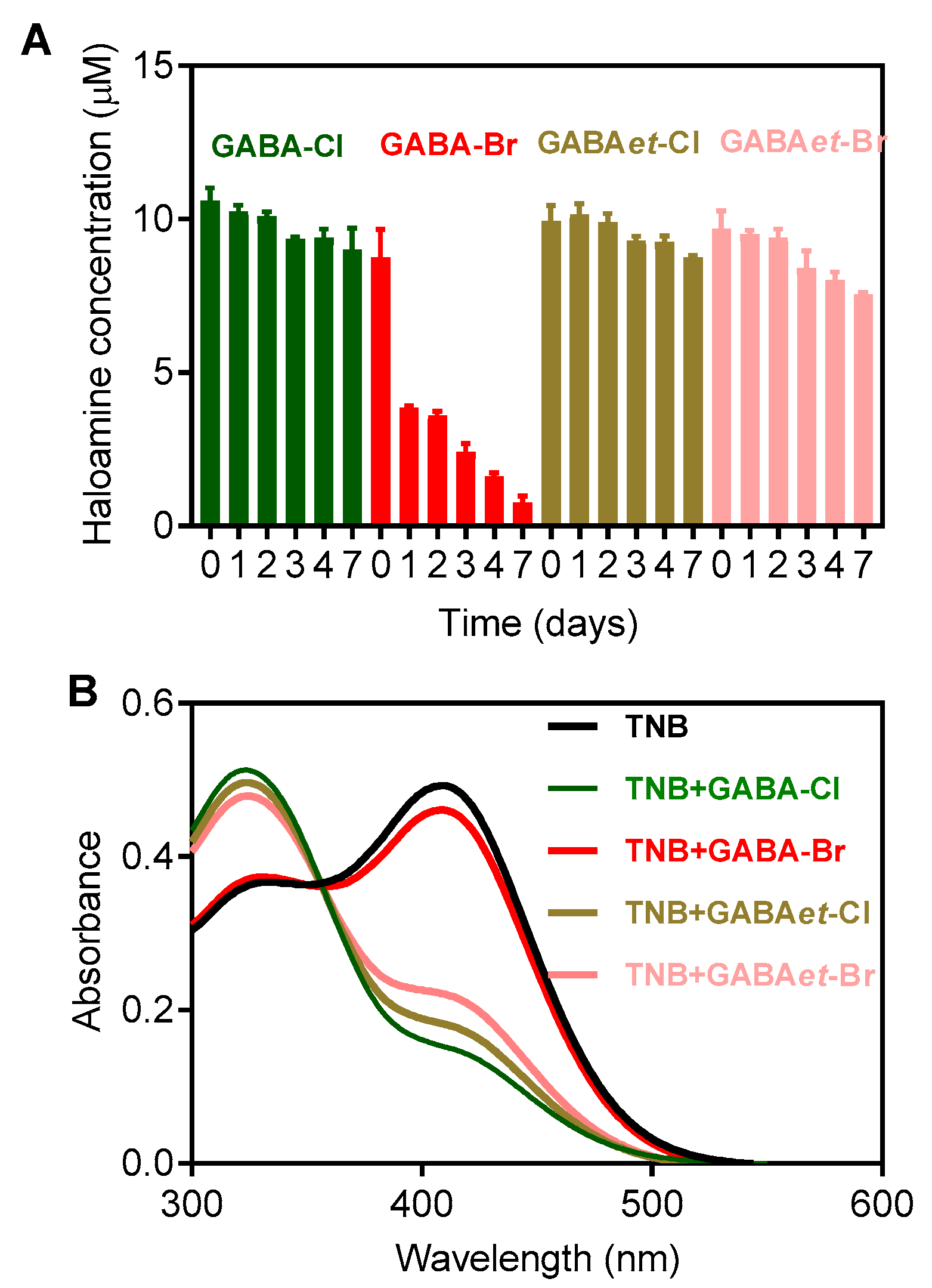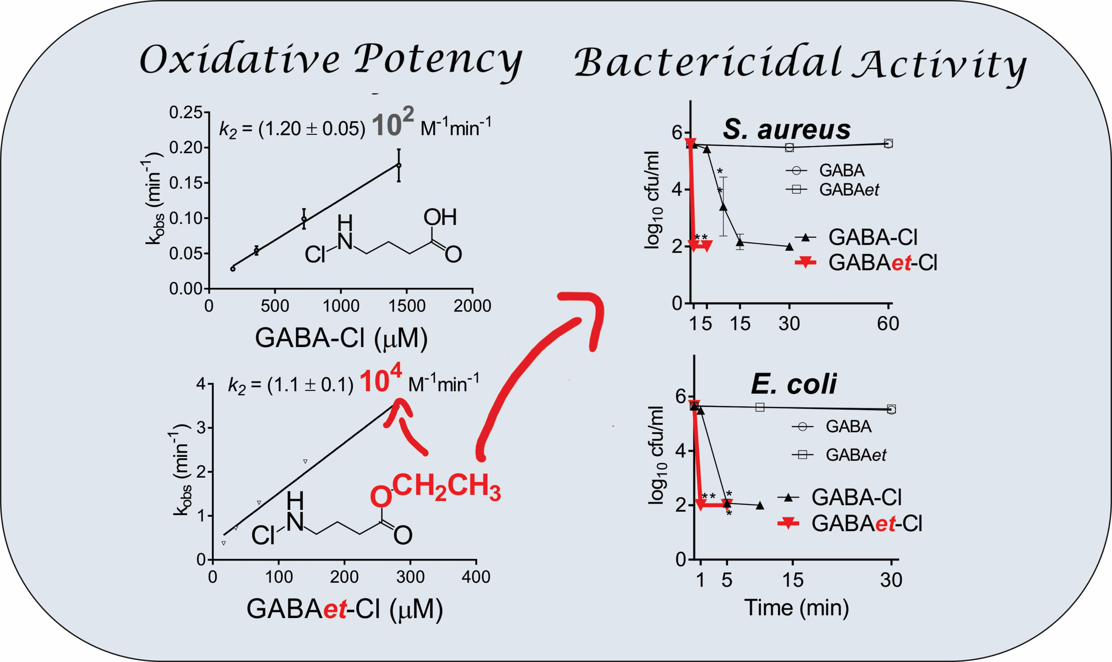 Chicago/Turabian StyleBertozo, Luiza de Carvalho, Markus Nagl, and Valdecir Farias Ximenes. 2025. "Haloamines of the Neurotransmitter γ-Aminobutyric Acid (GABA) and Its Ethyl Ester: Mild Oxidants for Reactions in Hydrophobic Microenvironments and Bactericidal Activity" Molecules 30, no. 21: 4227. https://doi.org/10.3390/molecules30214227