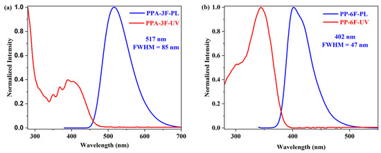 UV-Vis absorption (red line) and photoluminescence (blue line) spectra of the compounds (a) PPA-3F and (b) PP-6F in CH2Cl2. For PPA-3F, λₑₓ = 370 nm; for PP-6F, λₑₓ = 300 nm.