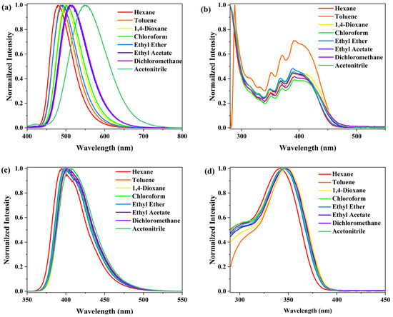 Emission (a,c) and absorption (b,d) spectra of PPA-3F (a,b) and PP-6F (c,d) measured in solvents of varying polarity. For PPA-3F, λₑₓ = 370 nm; for PP-6F, λₑₓ = 300 nm.