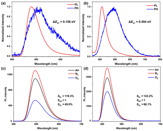 Steady-state photoluminescence (red line) and phosphorescence (blue line) spectra of compounds (a) PPA-3F (λex = 370 nm) and (b) PP-6F (λex = 340 nm) in toluene at 77 K. Steady-state emission spectra of compounds (c) PPA-3F and (d) PP-6F in toluene under air, nitrogen, and oxygen atmospheres (λex = 300 nm).
