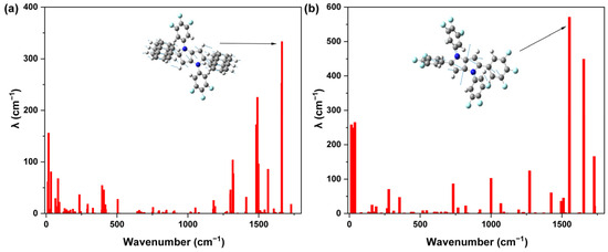 Calculated reorganization energies versus the normal mode wavenumber for the S1 → S0 emission process of (a) PPA-3F and (b) PP-6F.
