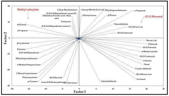 In three-factors model, factor 1 included 51.94% equivalents of covariance matrix, factor 2 had 25.48% and factor 3 only 6.41%. The highest impact on factor 1 exhibited two components: (Z)-2-hexenal (58.3% of variable contribution) of and methyl salicylate (39.5% of variable contribution), respectively. A similar situation was observed for factor 2; however, methyl salicylate had a stronger impact (52.9% of variable contribution) than (Z)-2-hexenal (34.4% of variable contribution). Factor 3 proved more complex than factor 1 and factor 2. The highest impact on its variable contributions was shown by thymoquinone (28.3%), p-methyl anisole (23.4%), (E)-2-decenal (19.4%) and salicylaldehyde (12.8%). Contributions of remaining components were under 5%.
