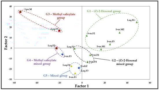 Generally, samples may be divided into five groups (clusters) in Figure 2. Group 1 was composed of I.aq.F6, I × m.M2, I × m.F5, I × m.M1 and I × m.F2. Concentration of (Z)-2-hexenal above 30% was the main criterion of samples similarity. For this reason, Group 1 was named “(Z)-2-Hexenal group”.