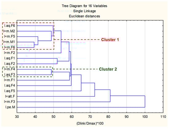 Cluster 2 contained I.aq.F1 and I × m.F4. Specimens which grouped in this cluster had similar concentrations of (Z)-3-Hexen-1-ol (around 12–13%), salicylaldehyde (around 10–15%) and some minor components (>5%).