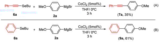 To further explore the synthetic utility of and demonstrate the potential of alkynyl and aryl selenide derivatives as starting materials, we evaluated their reactivity in cobalt-catalyzed cross-coupling reactions. Under standard conditions, compound 6a coupled with Grignard reagent 2a to afford product 7a in 35% yield (Scheme 3A). More encouragingly, the reaction of aryl selenide 8a furnished the corresponding biaryl 9a in 61% yield (Scheme 3B), demonstrating the particular effectiveness of this substrate class.