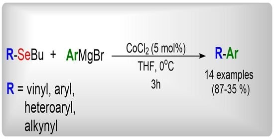 As part of our ongoing interest in organoselenium chemistry and in the development of new synthetic methodologies [,,,,,,,], we herein report a cobalt-catalyzed cross-coupling of diverse organoselenides (vinyl, heteroaryl, aryl, and alkynyl) with Grignard reagents using CoCl2 as a simple, efficient catalyst.