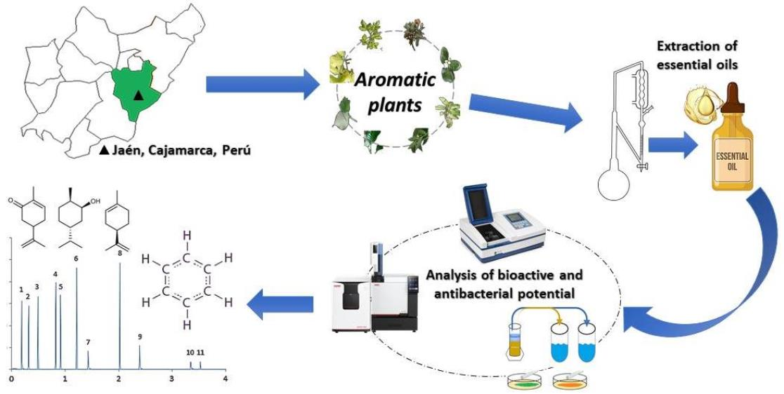 Fernandez-Rosillo, F.; Aguirre, E.; Quiñones Huatangari, L.; Chavez, S.G.; Caetano, A.C.; Iliquin-Chavez, A.F.; Silva-Zuta, M.Z.; Castro-Alayo, E.M.; Balcázar-Zumaeta, C.R. Discovering the Bioactive and Antibacterial Potential of Essential Oils from Aromatic Plants of Northeastern Peru. Molecules 2025, 30, 4236. https://doi.org/10.3390/molecules30214236