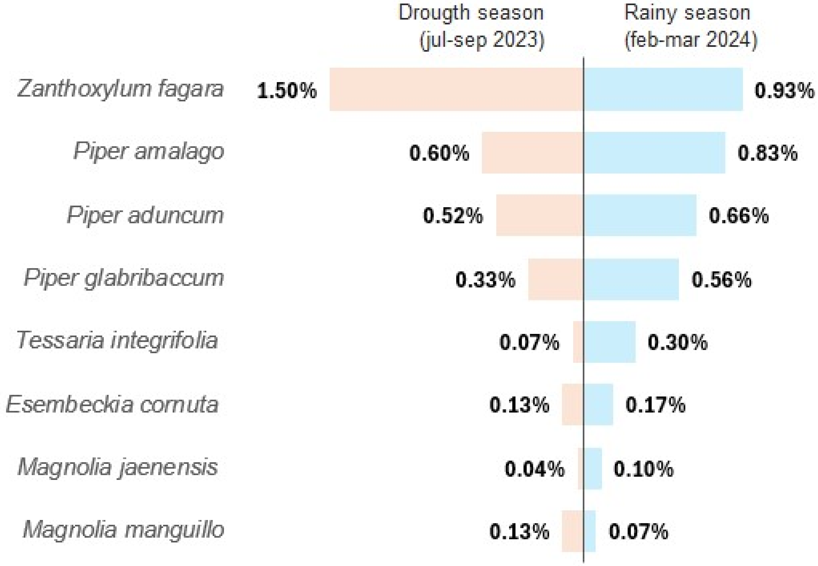 | Z. fagara | 20.00 ± 4.58 | 6.46 ± 0.34 | 32.28 | L | 20.33 ± 9.07 | 6.89 ± 1.54 | 33.88 | L | 16.00 ± 0.00 | 10.04 ± 3.98 | 62.78 | I |