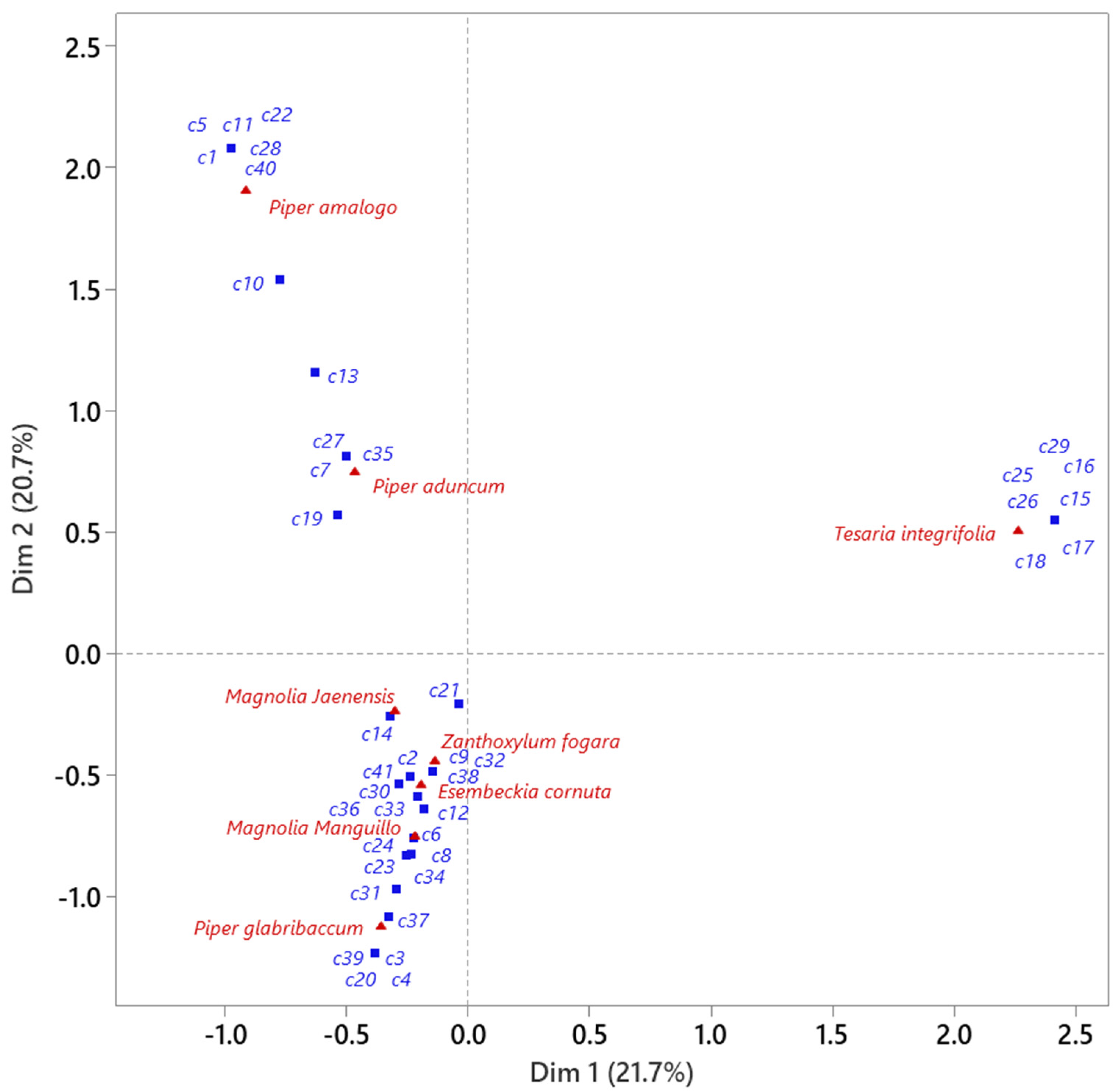 - Perigo, C.V.; Torres, R.B.; Bernacci, L.C.; Guimarães, E.F.; Haber, L.L.; Facanali, R.; Vieira, M.A.; Quecini, V.; Marques, M.O.M. The Chemical Composition and Antibacterial Activity of Eleven Piper Species from Distinct Rainforest Areas in Southeastern Brazil. Ind. Crops Prod. 2016, 94, 528–539. [Google Scholar] [CrossRef]